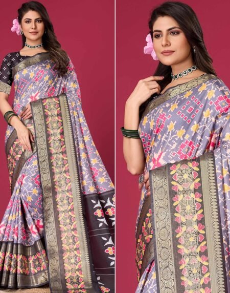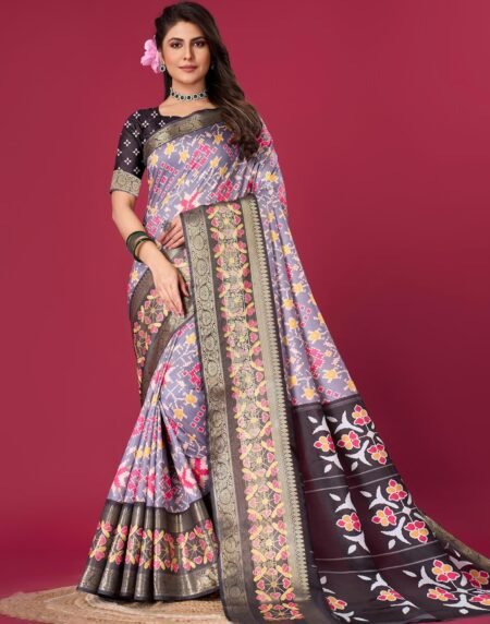 Grey & Black Digital Patola Printed With Woven Border Dola Silk Saree
