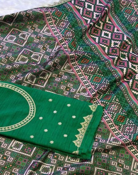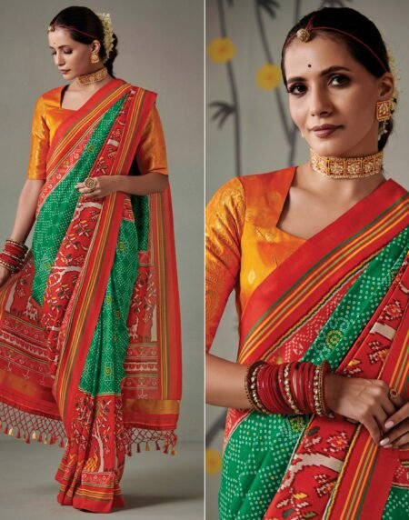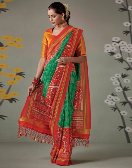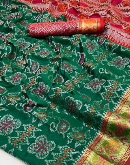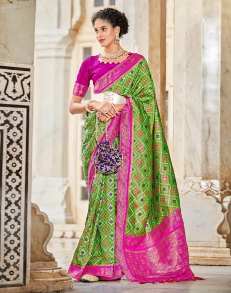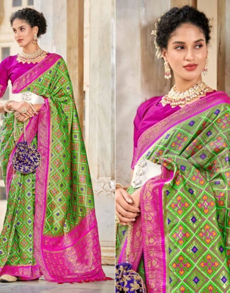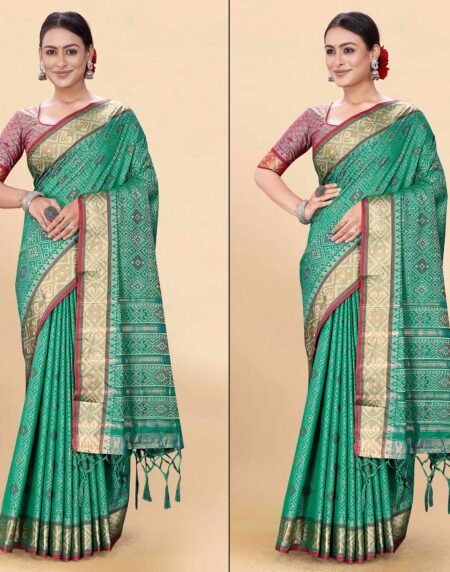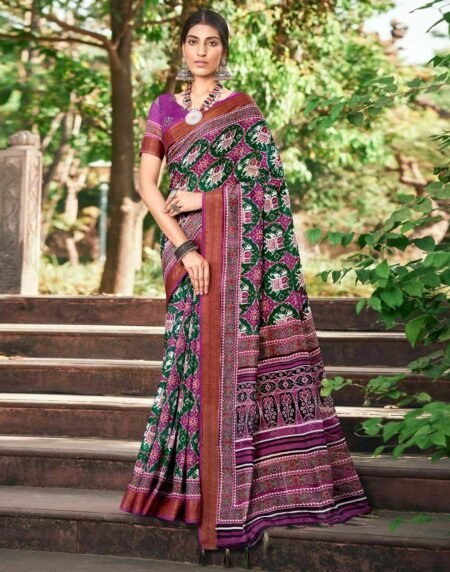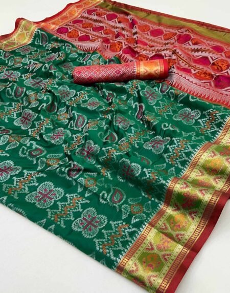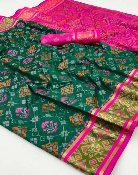 Green Silk Blend Saree Featuring Patola Prints and a Detailed Weaving Border