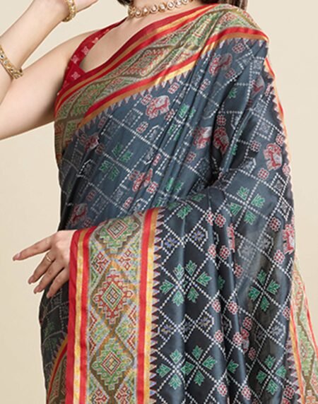 Grey Silk Blend Saree Featuring Patola Prints and a Detailed Weaving Border