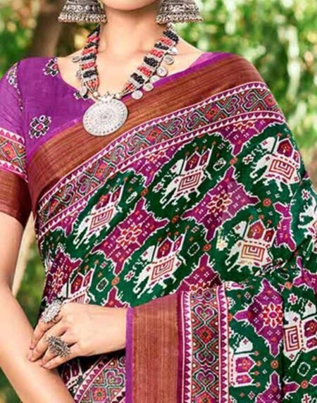 Green-Purple Patola Printed Cotton Silk Saree With Tassels
