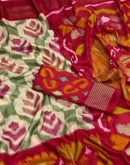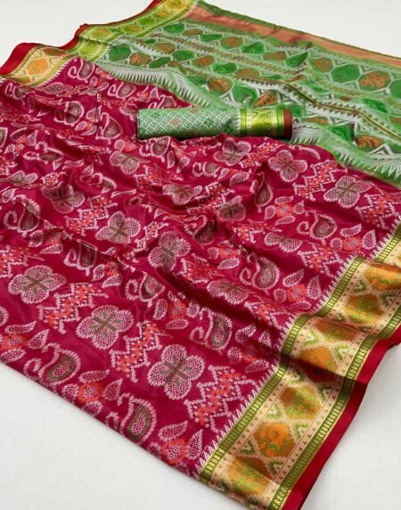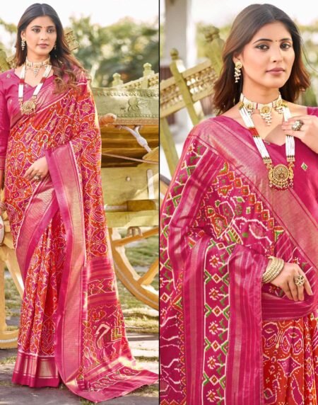 Pink & Orange Patola Printed Viscose Saree With Zari Border