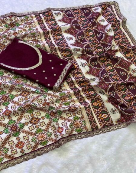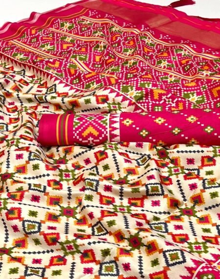 Off White & Pink Patola Printed Viscose Saree With Zari Border