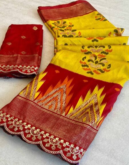 Yellow Patola Printed Dola Silk Saree With Sequins Border