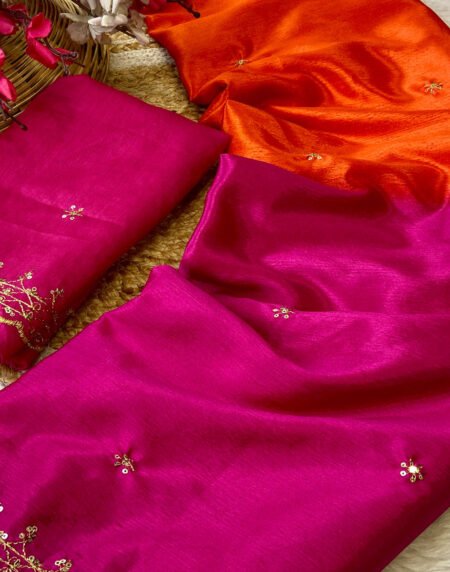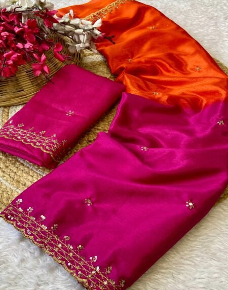 Pink & Orange Chinon Saree With Delicate Floral Sequins Work And Lace Border