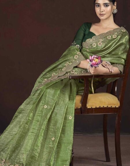Green Crunchy Organza Silk Saree Adorned With Intricate Floral Sequins Embroidery
