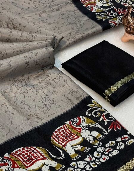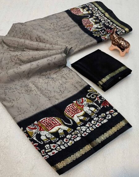 Grey Dola Silk Saree With Abstract Patterns And Kalamkari Pallu Art