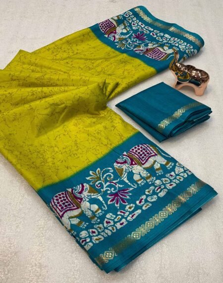 Lemon Green Dola Silk Saree With Abstract Patterns And Kalamkari Pallu Art