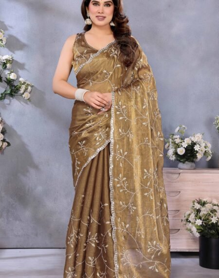 Golden Brown Jimmy Choo Chiffon Saree Adorned with Delicate Floral Sequins Embroidery