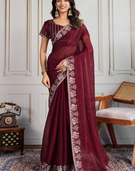 Maroon Festive Wear Silk Blend Saree with Embroidery & Stones