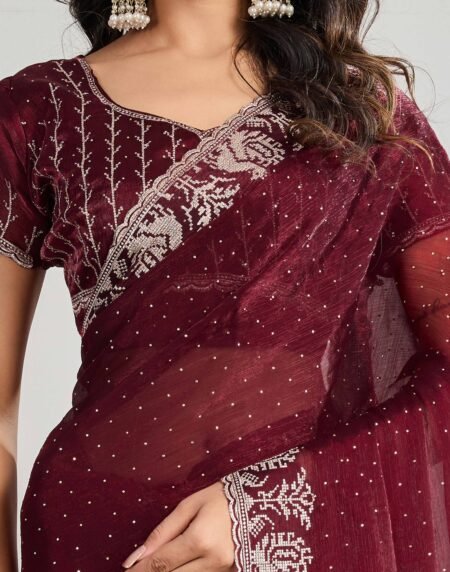 Maroon Net Saree With Floral Thread Embroidery Adorned In Stone & Mirror Accents