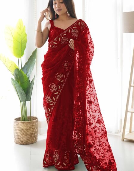 Maroon Net Saree With Floral Thread Embroidery Adorned In Stone & Mirror Accents
