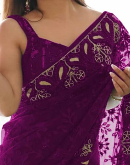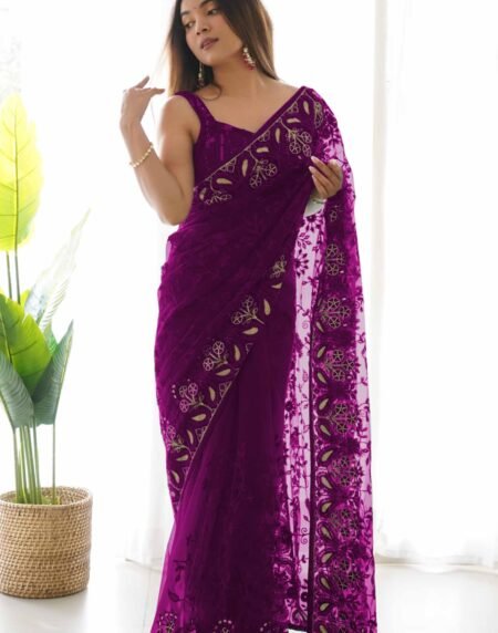 Purple Net Saree With Floral Thread Embroidery Adorned In Stone & Mirror Accents