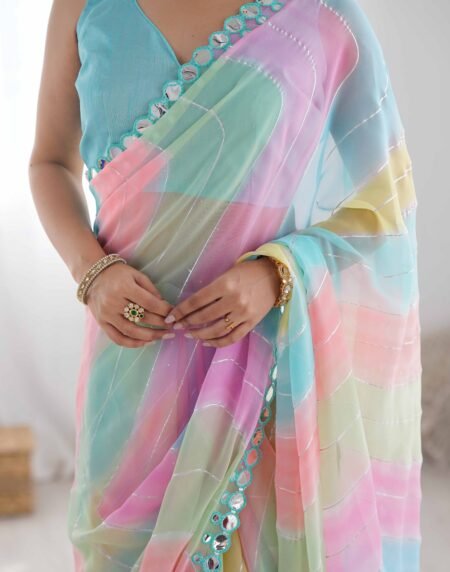 Rose Pink Ombre Chinon Saree With Mirror Border
