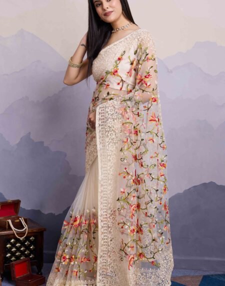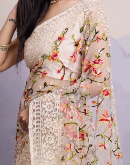 Off White Floral Embroidered Net Saree