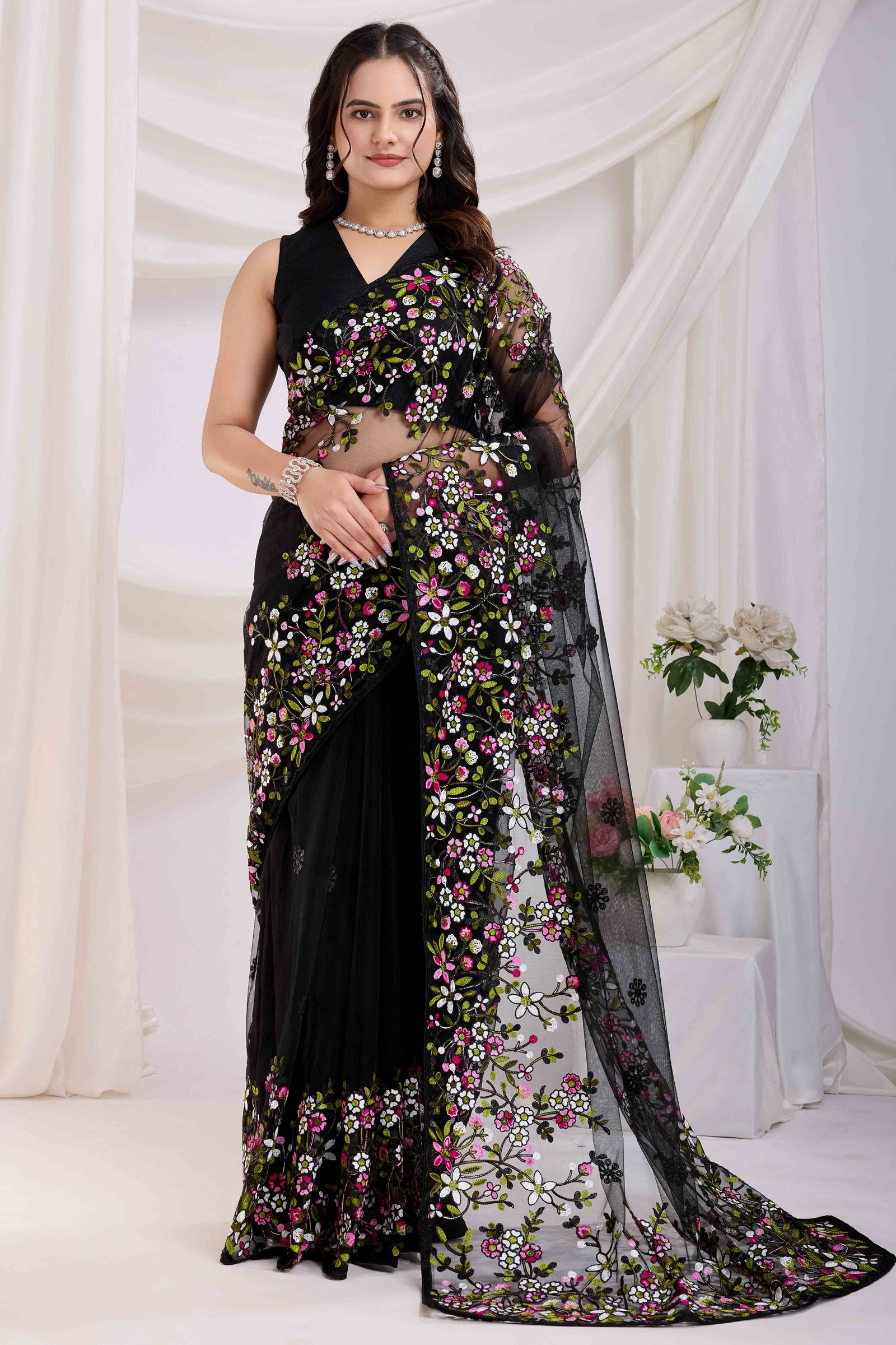 Black colored saree is made from net fabric which is highlighted with beautiful floral embroidered work as shown. Comes along with unstitched mono banglory blouse piece which you can customise as per your design/style. Occasion – You can wear this saree for party, festive and functions. Note:- the actual product may differ slightly in color and design from the one illustrated in the images when compared with computer or mobile screen.