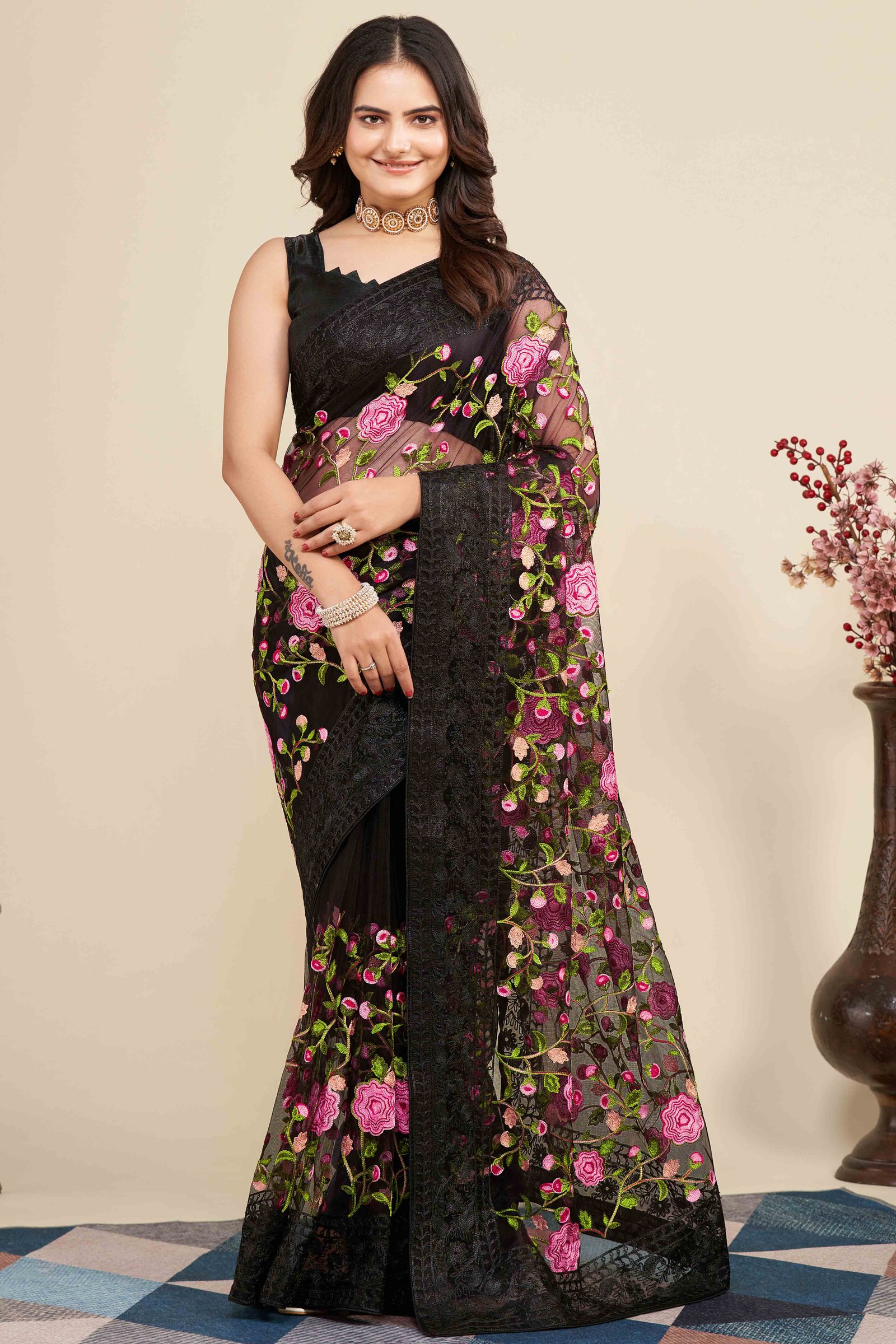 • Vibrant Elegance: Black colored saree adorned with beautiful floral embroidery work, showcasing a bold and festive style as shown.