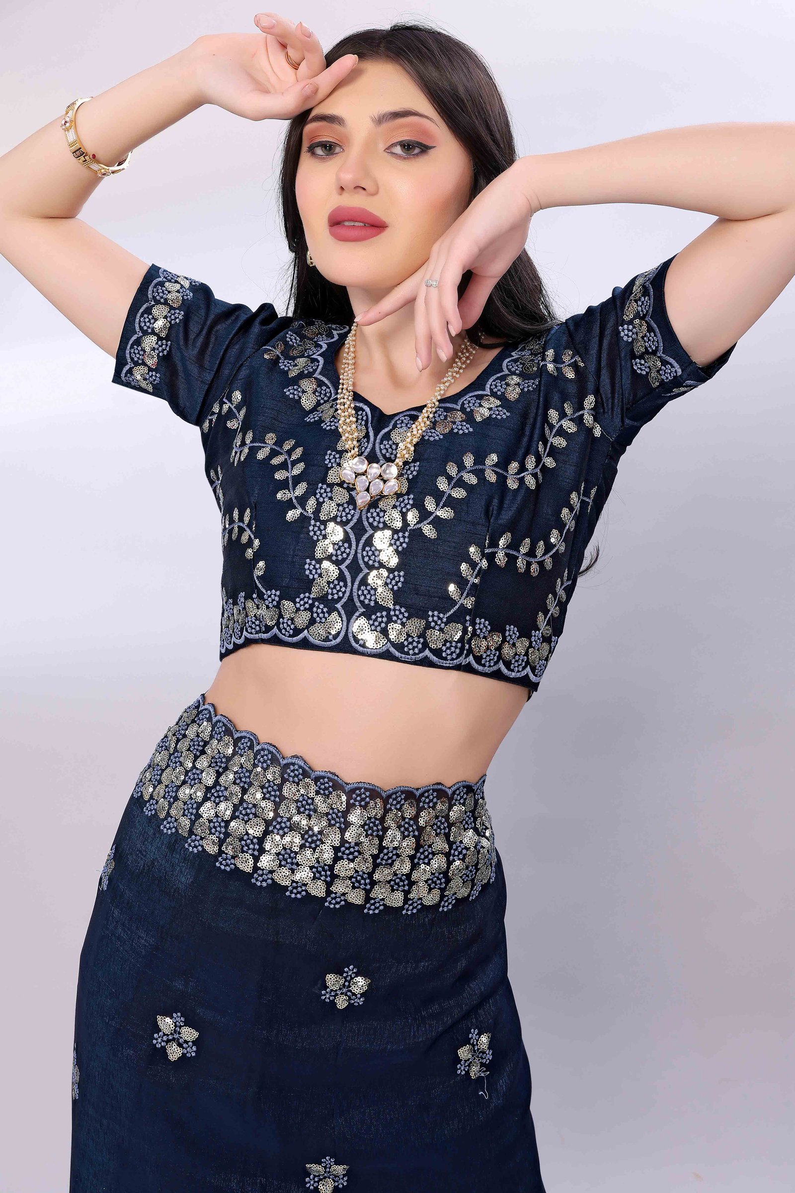 - Elegant Allure: Make a lasting impression in this striking blue color saree, beautifully decorated with intricate floral thread embroidery and shimmering sequin accents that elevate its traditional elegance.