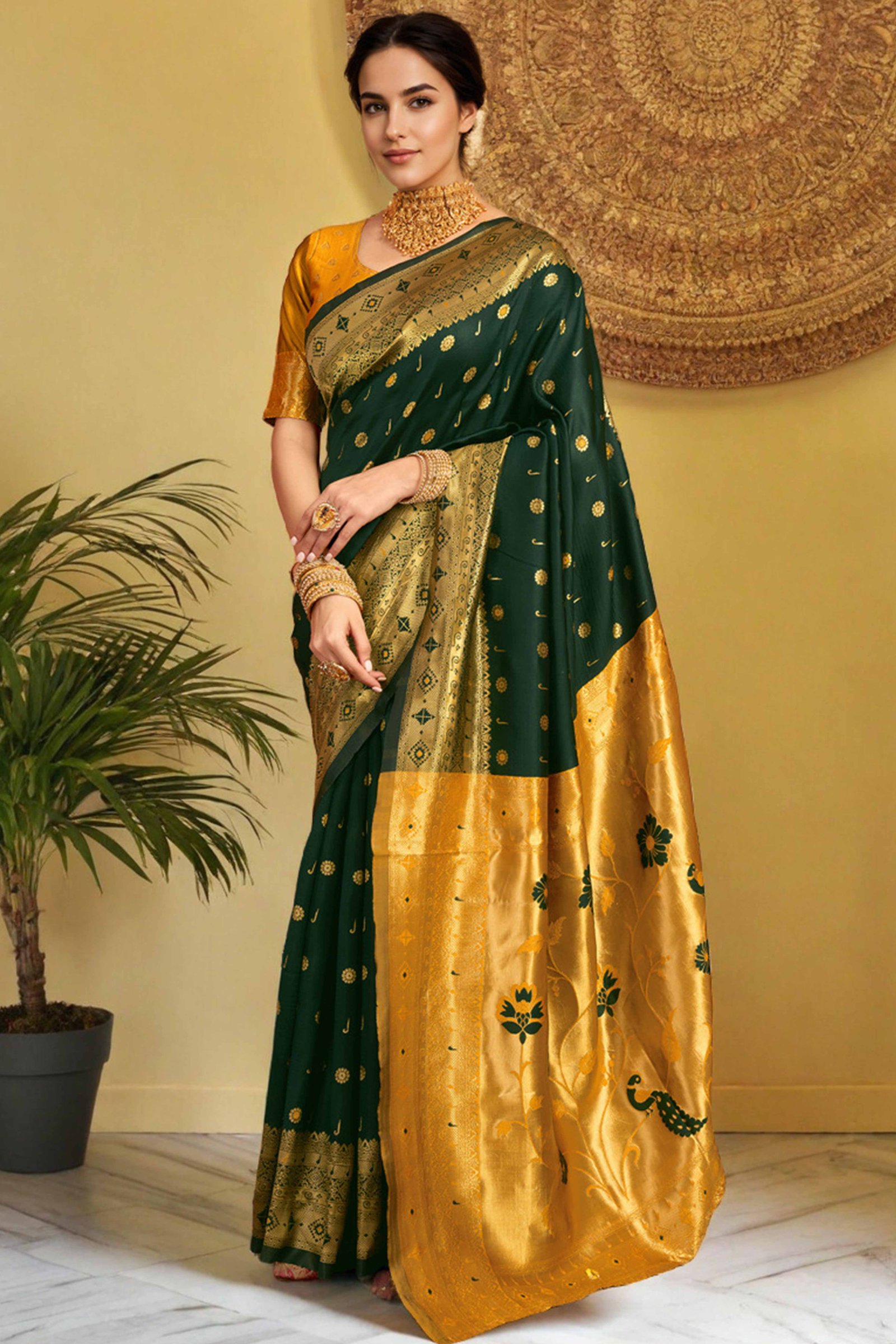 Dark Green Silk Blend Saree With Traditional Paithani Zari Weaving Of Peacock & Floral Designs