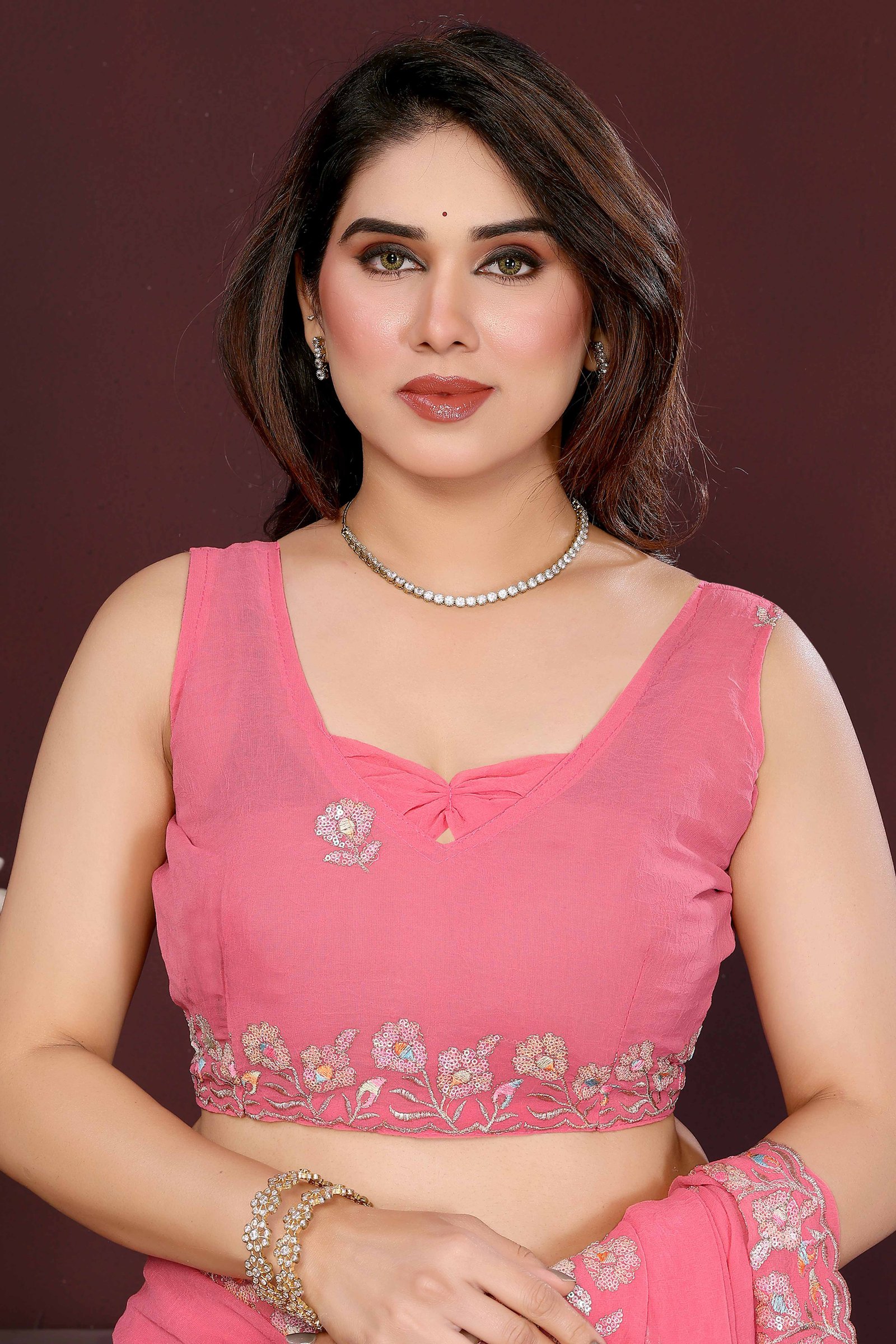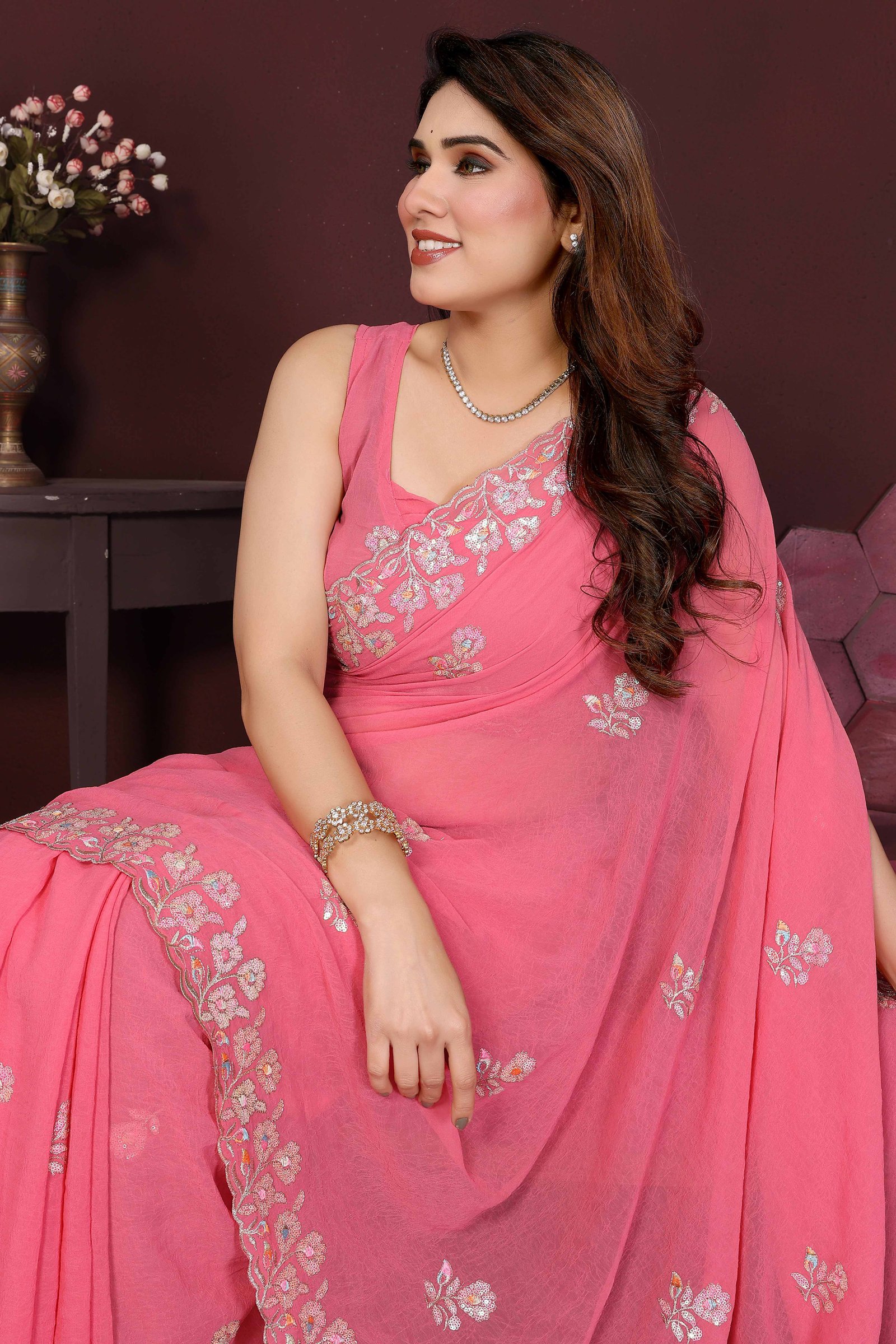 - Chic & Feminine: Make a graceful statement with this Gajrai pink georgette saree, embellished with delicate floral sequins embroidery that adds a radiant sparkle to your ethnic look.