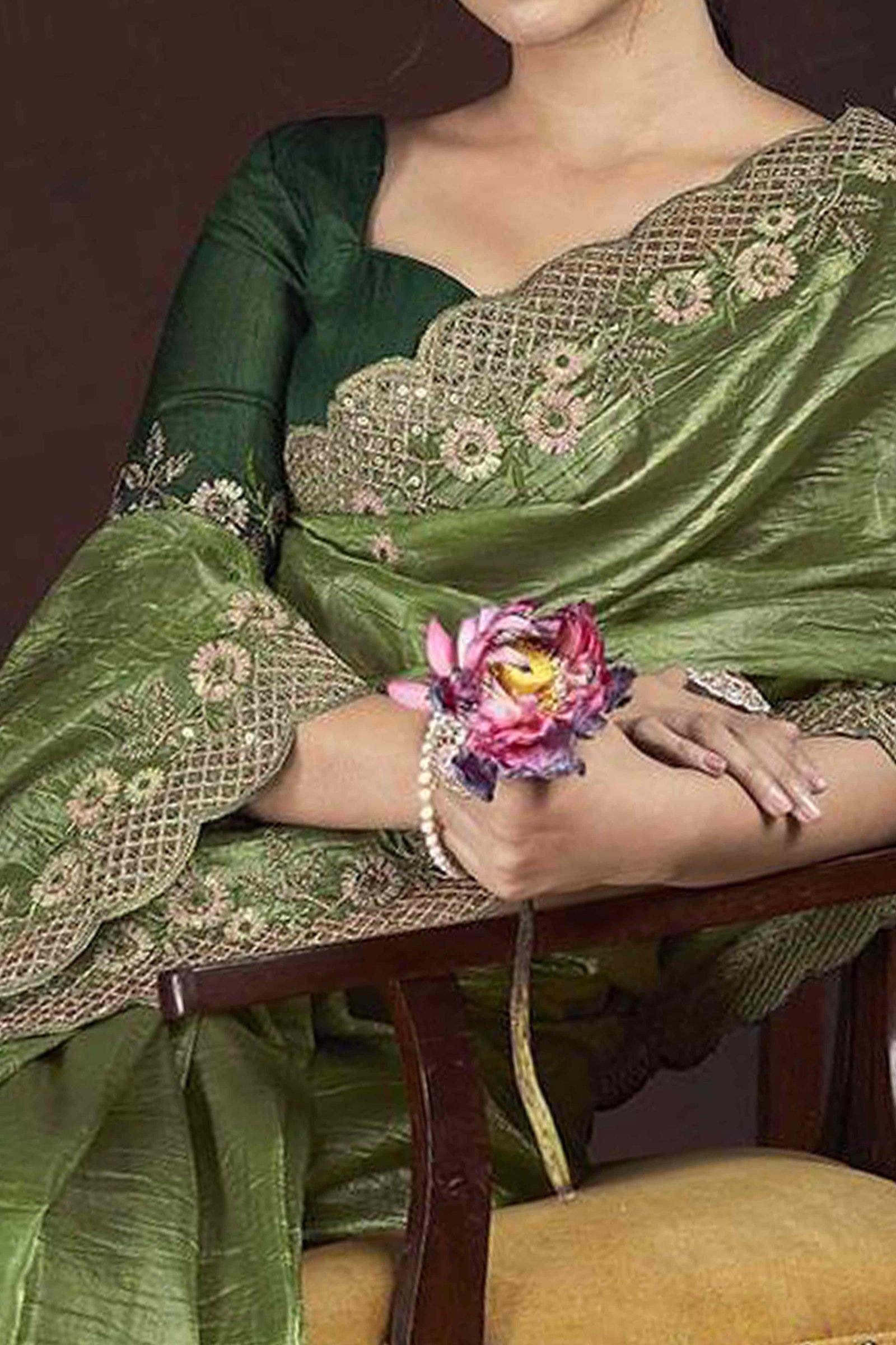 - Timeless Elegance: Green colored saree adorned with beautiful floral embroidery work, showcasing a sophisticated and festive style as shown.