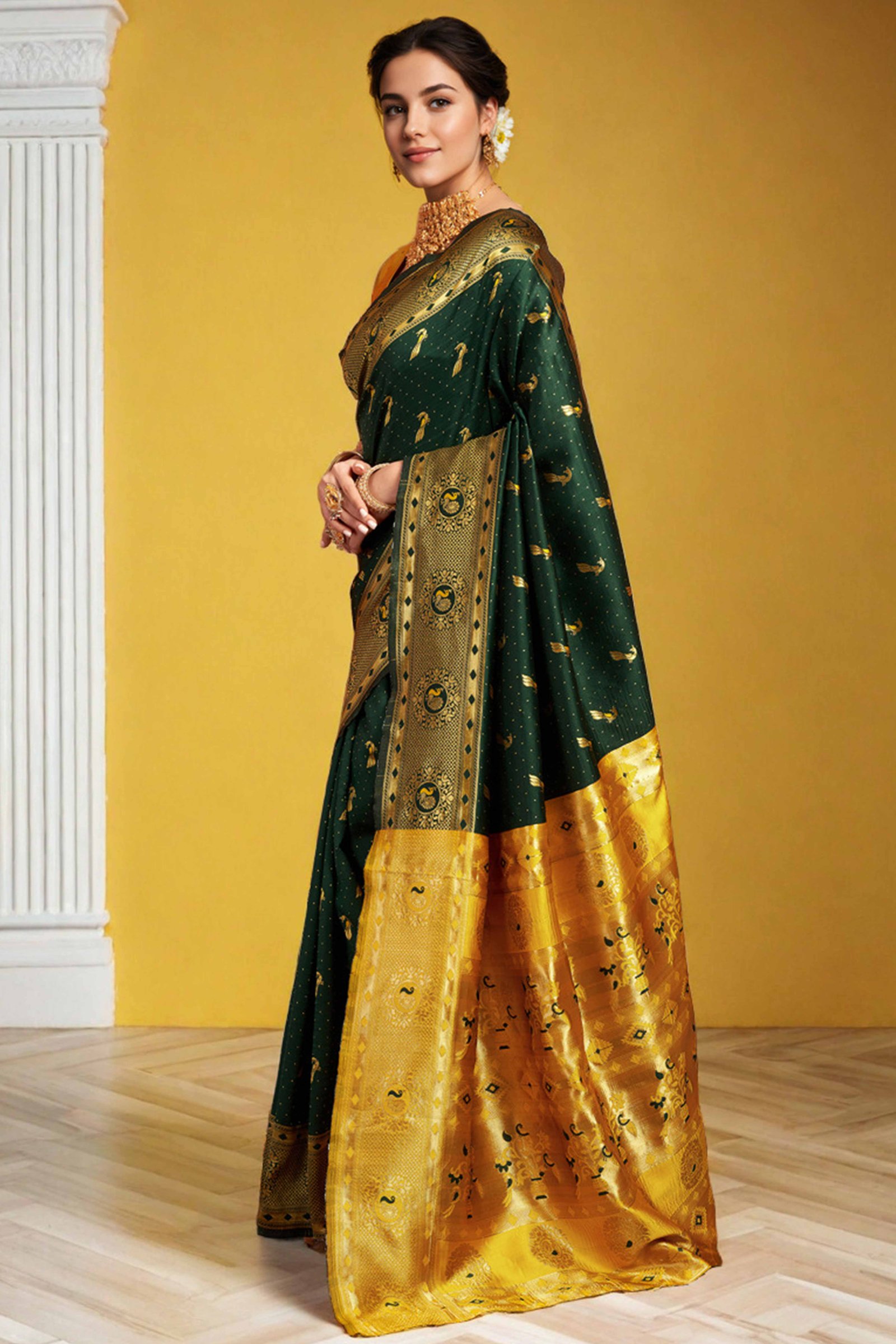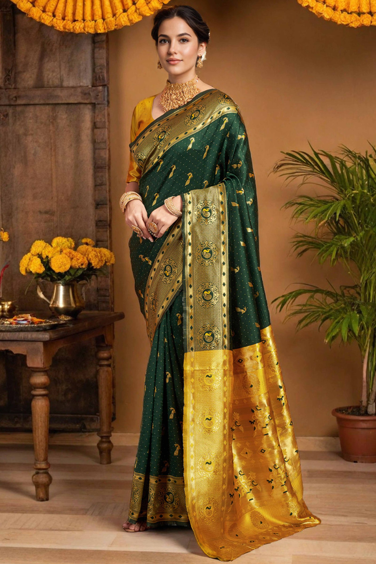 - Elegant Appeal: Step into timeless elegance with this exquisite green Paithani saree, adorned with intricate zari weaving and a meticulously crafted peacock and floral motif pallu. A graceful blend of tradition and sophistication, it’s designed to make a lasting impression at every special occasion.