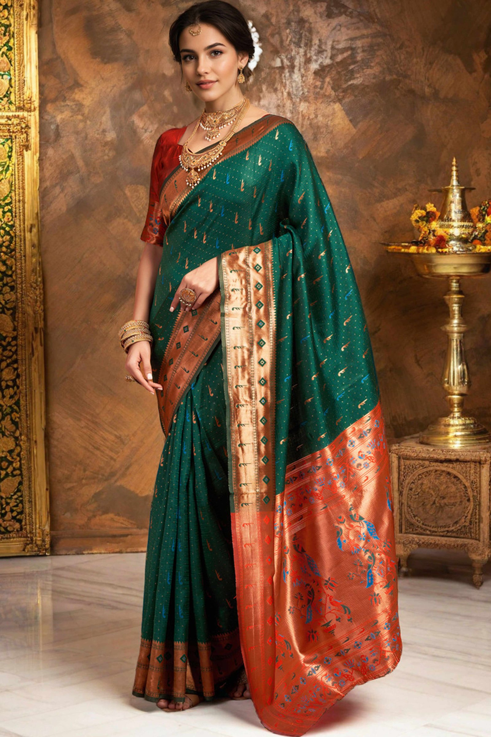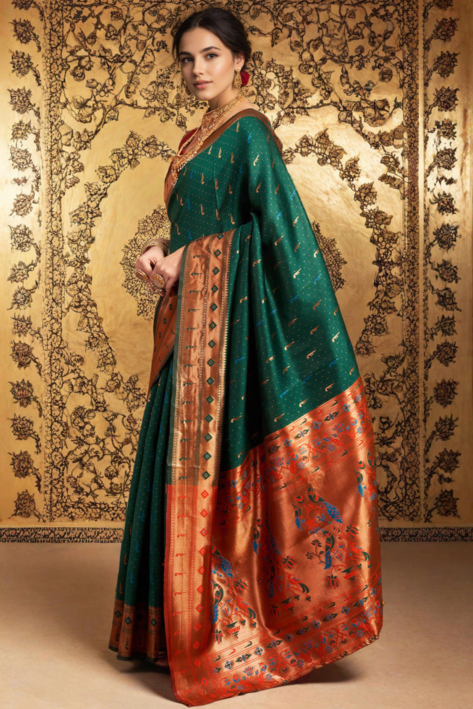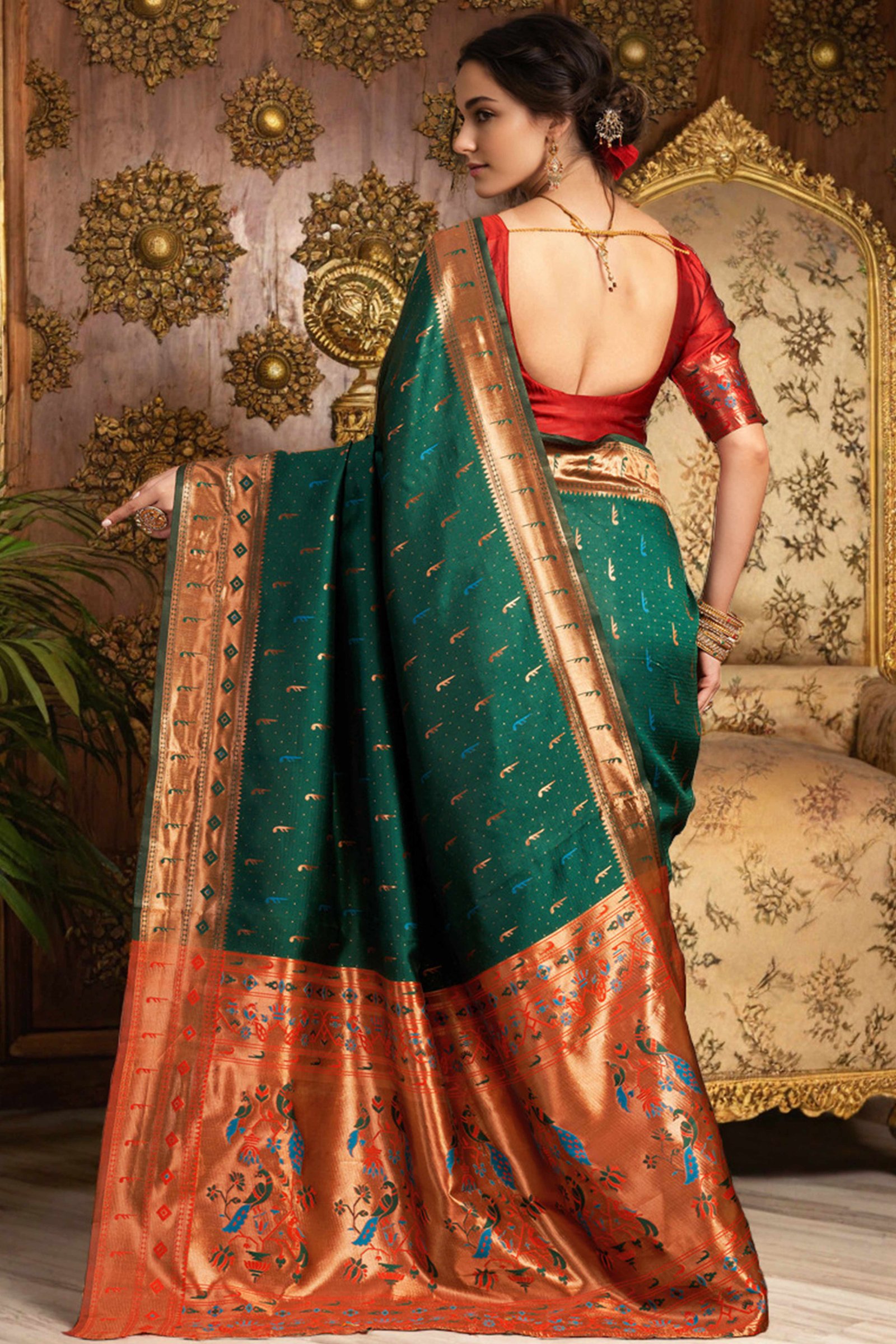 - Elegant Appeal: Infuse timeless elegance into your ethnic wardrobe with this stunning green Paithani saree, adorned with intricate zari weaving and a gracefully detailed peacock motif pallu. A perfect blend of heritage and sophistication, it creates a striking impression at any special occasion.