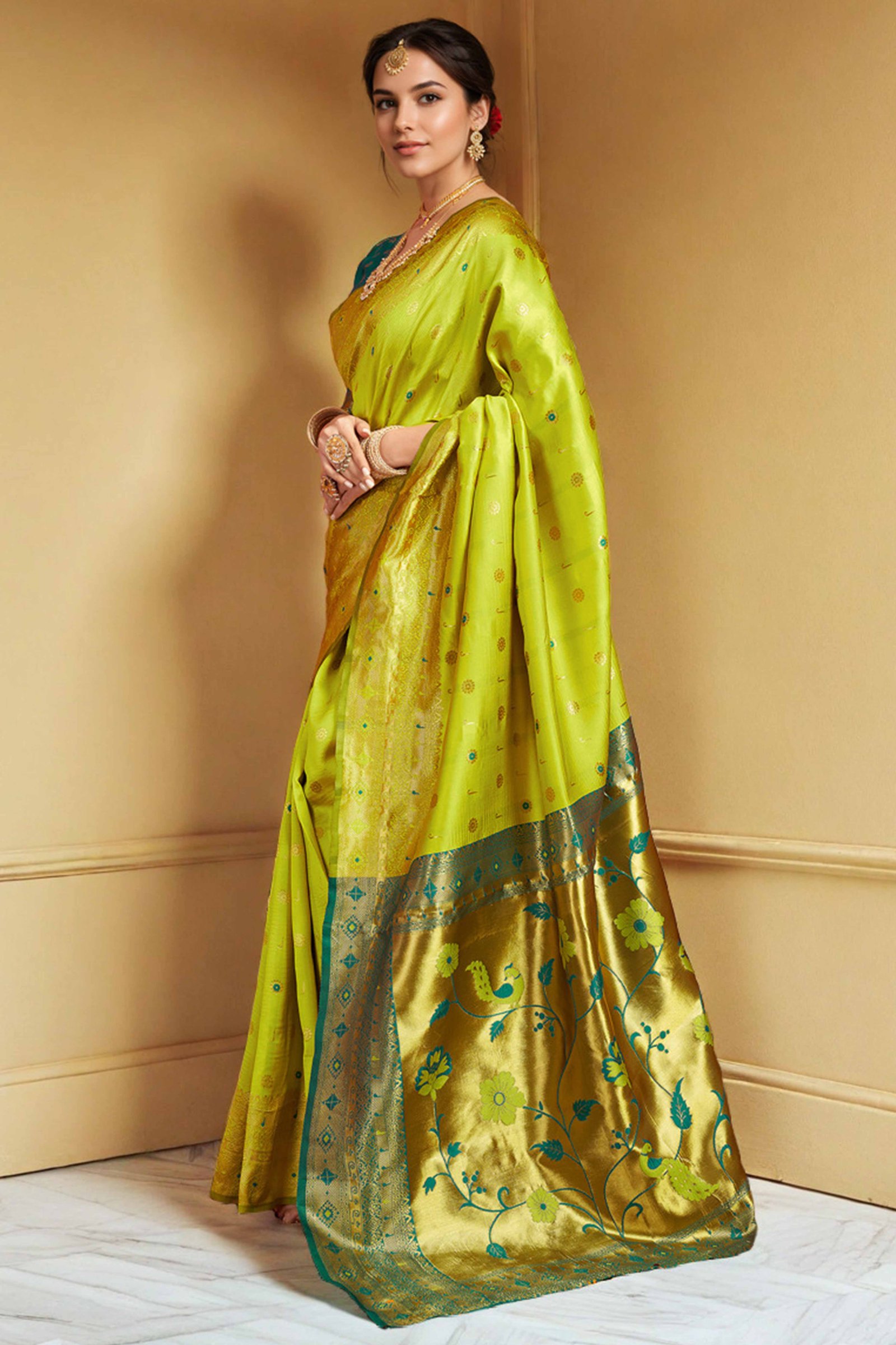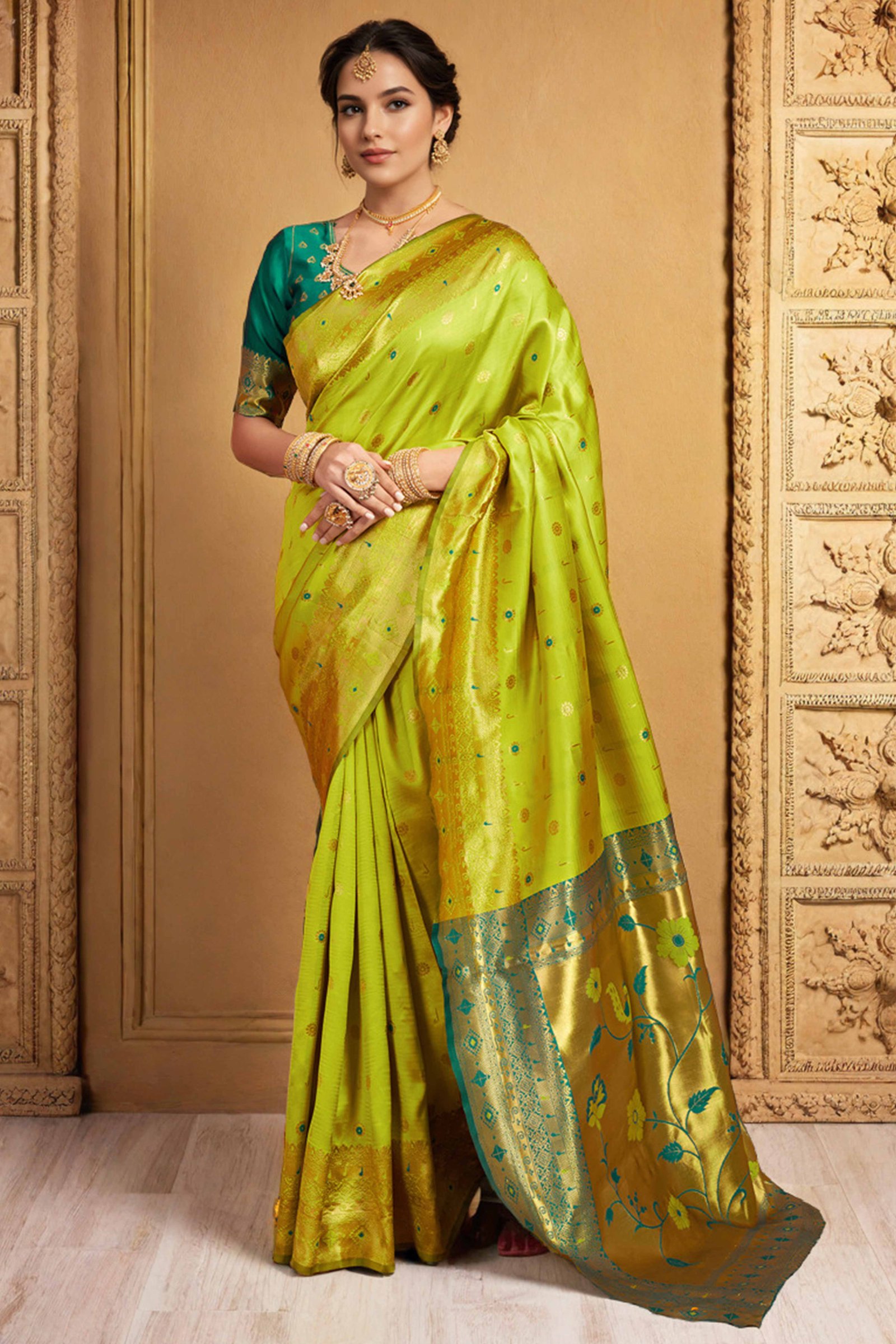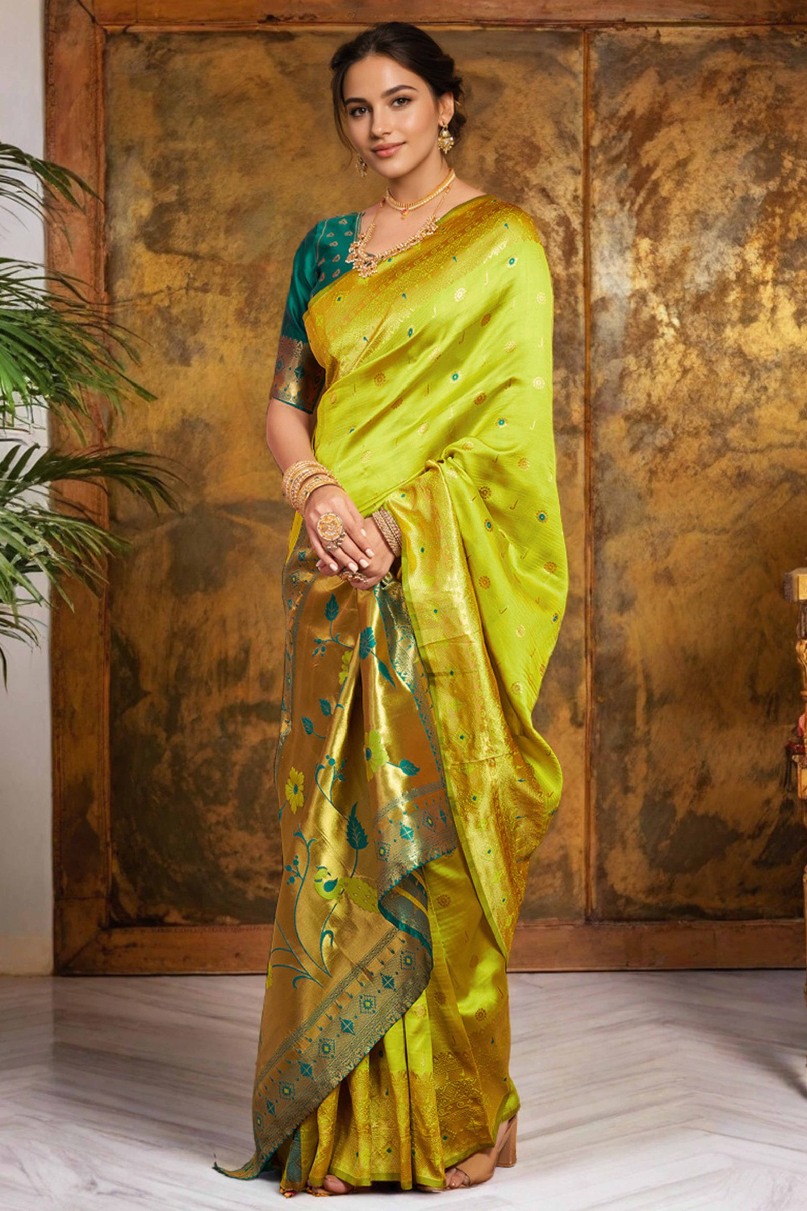 Green Silk Blend Saree With Traditional Paithani Zari Weaving Of Peacock & Floral Designs