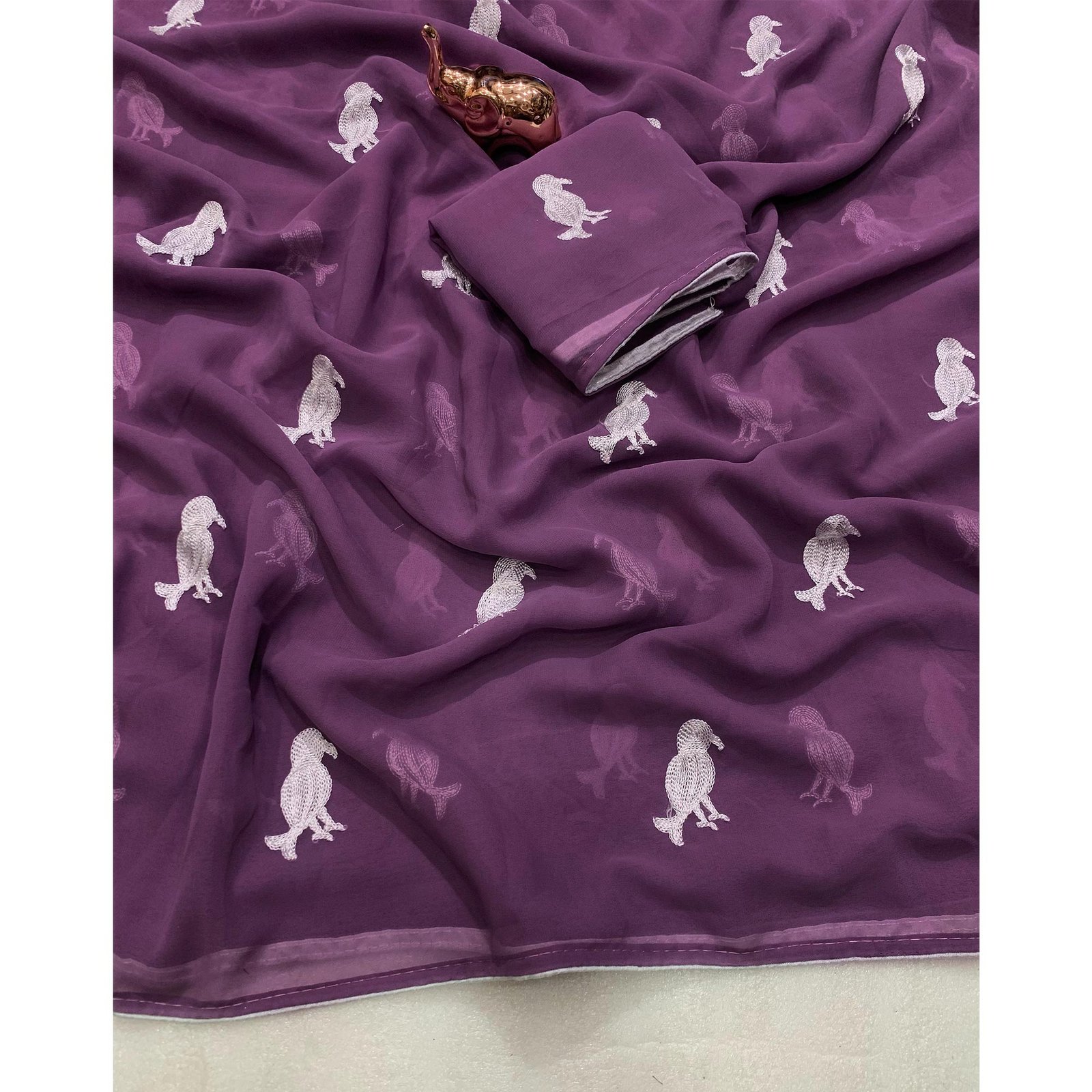 - Details: Light Purple colored saree is made from georgette fabric and is highlighted with beautiful bird embroidery as shown.