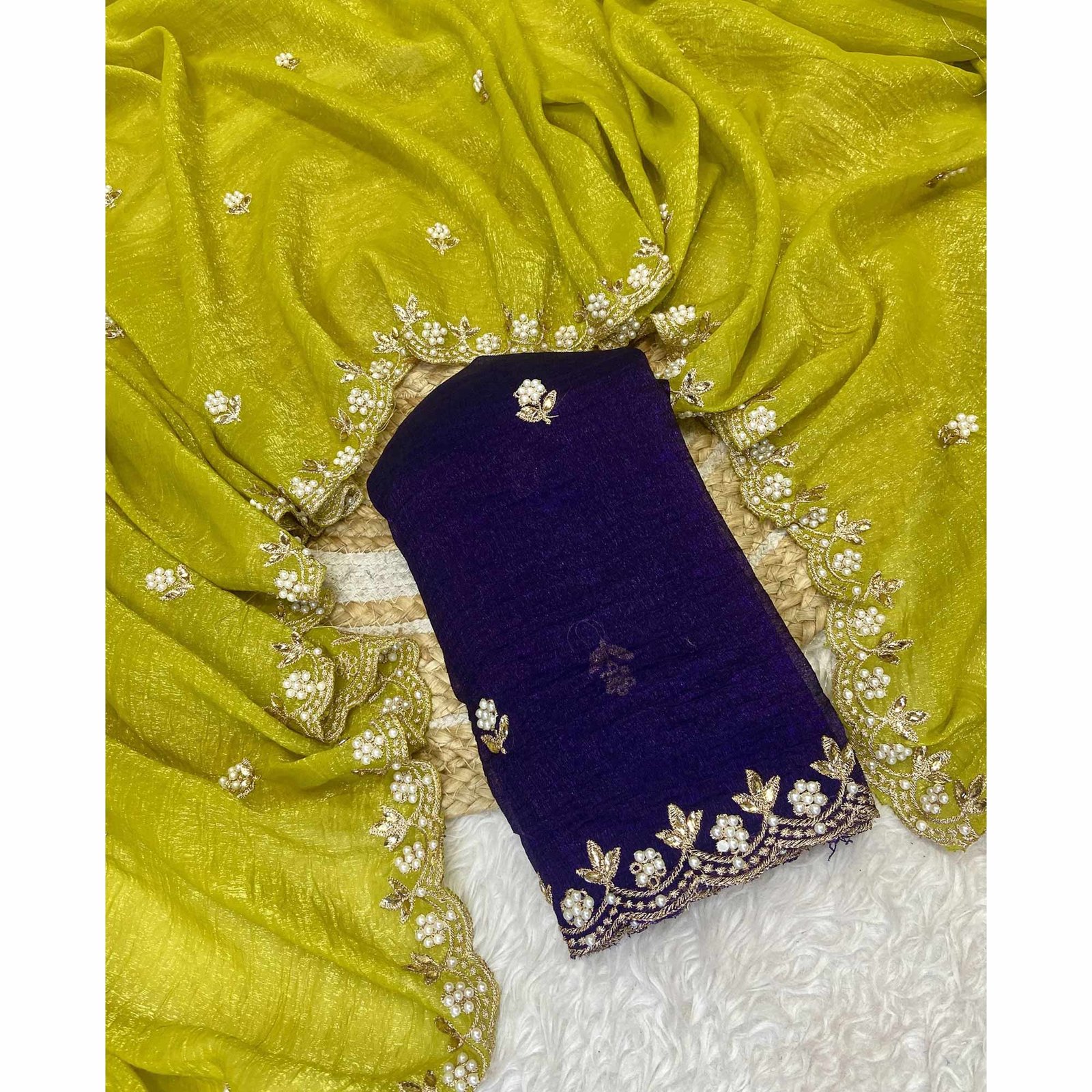 - Complete Ensemble: Includes an unstitched embroidered crunchy chiffon blouse piece, customizable to your preferred design and style.