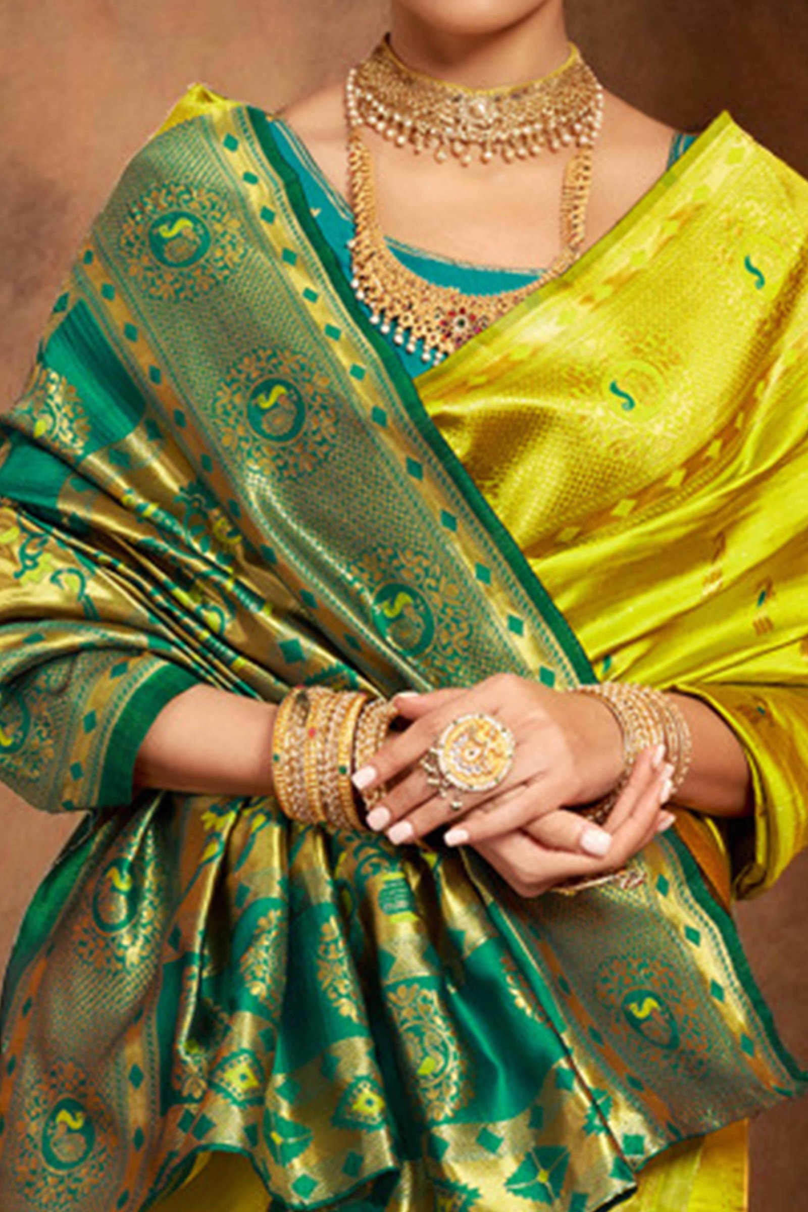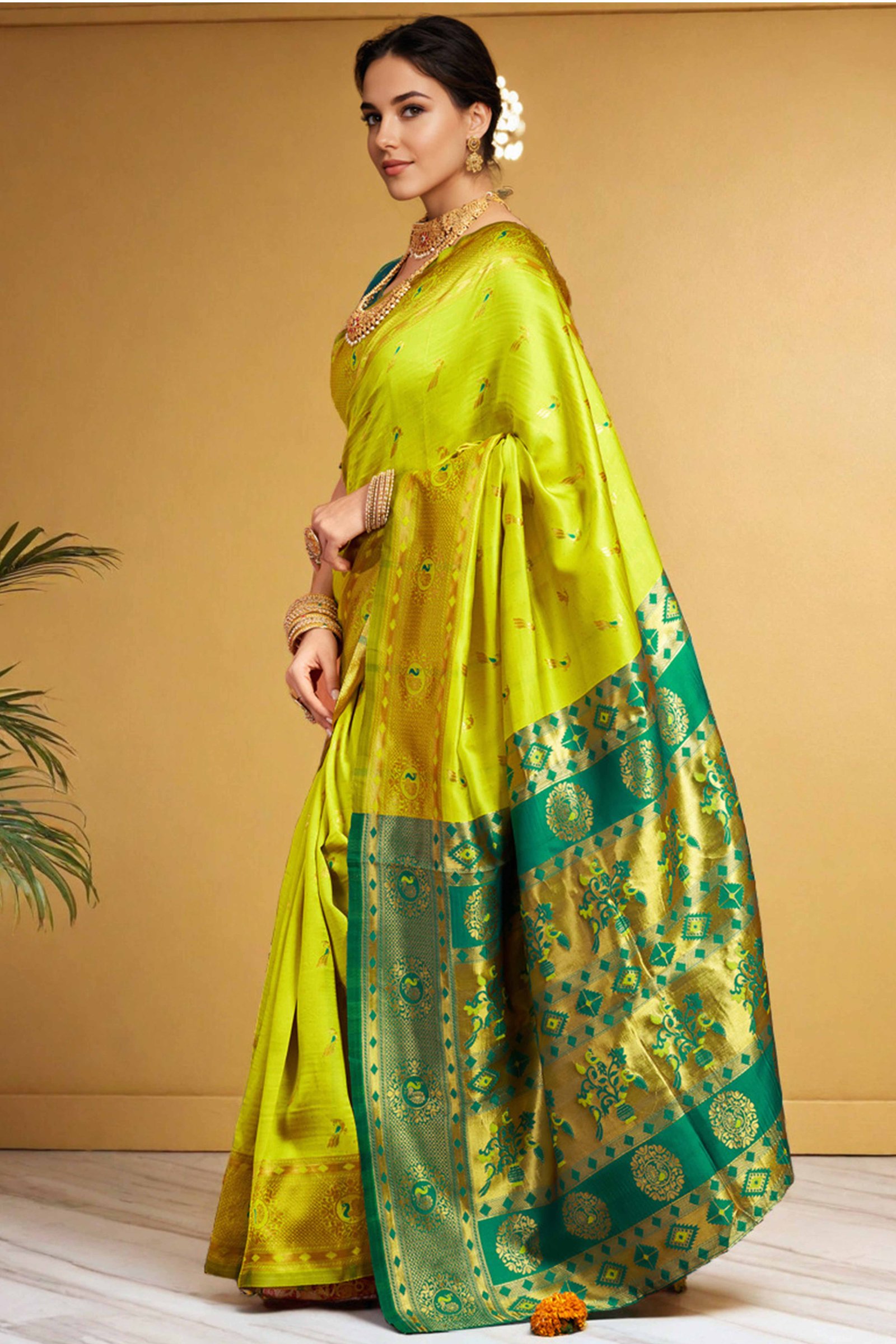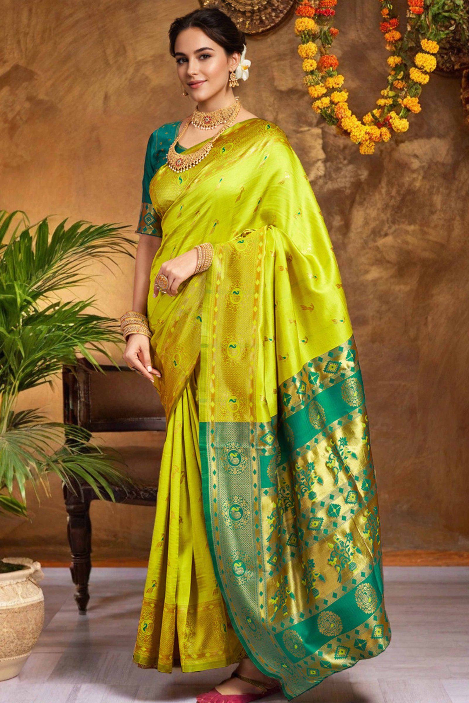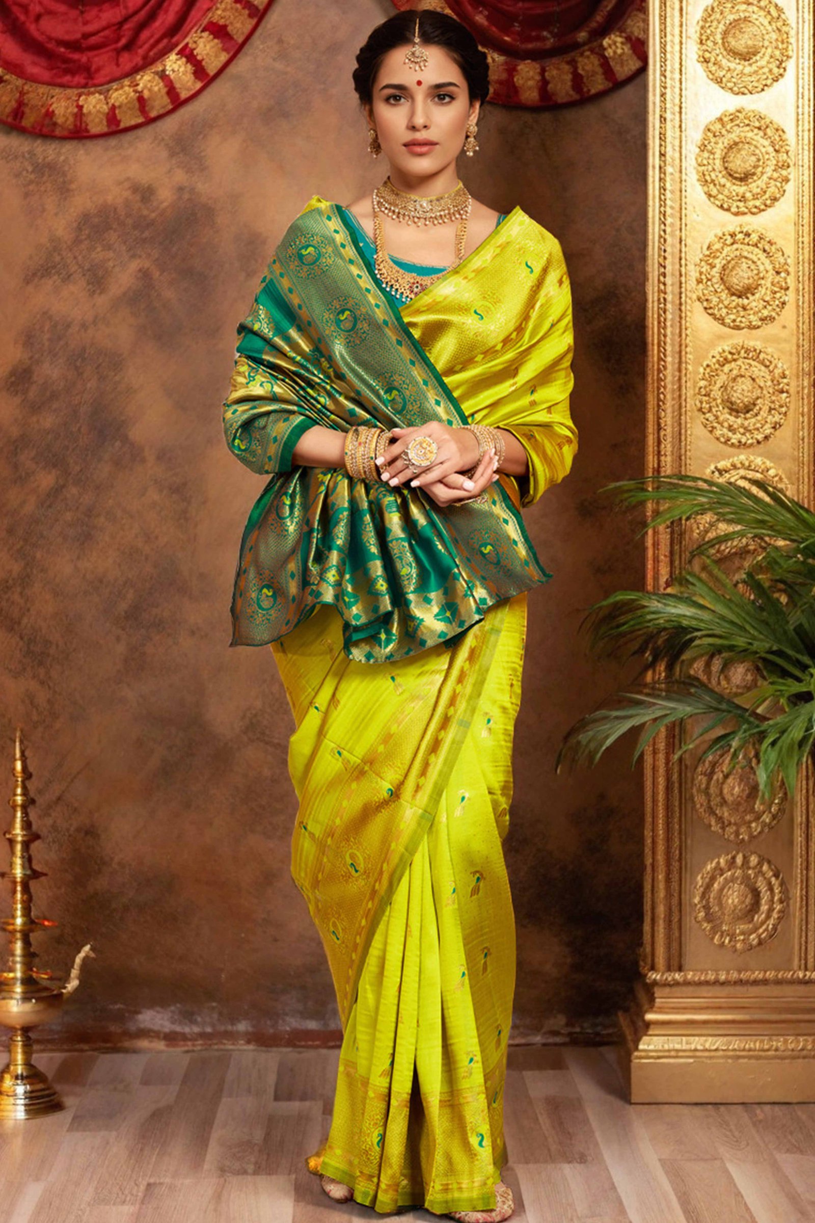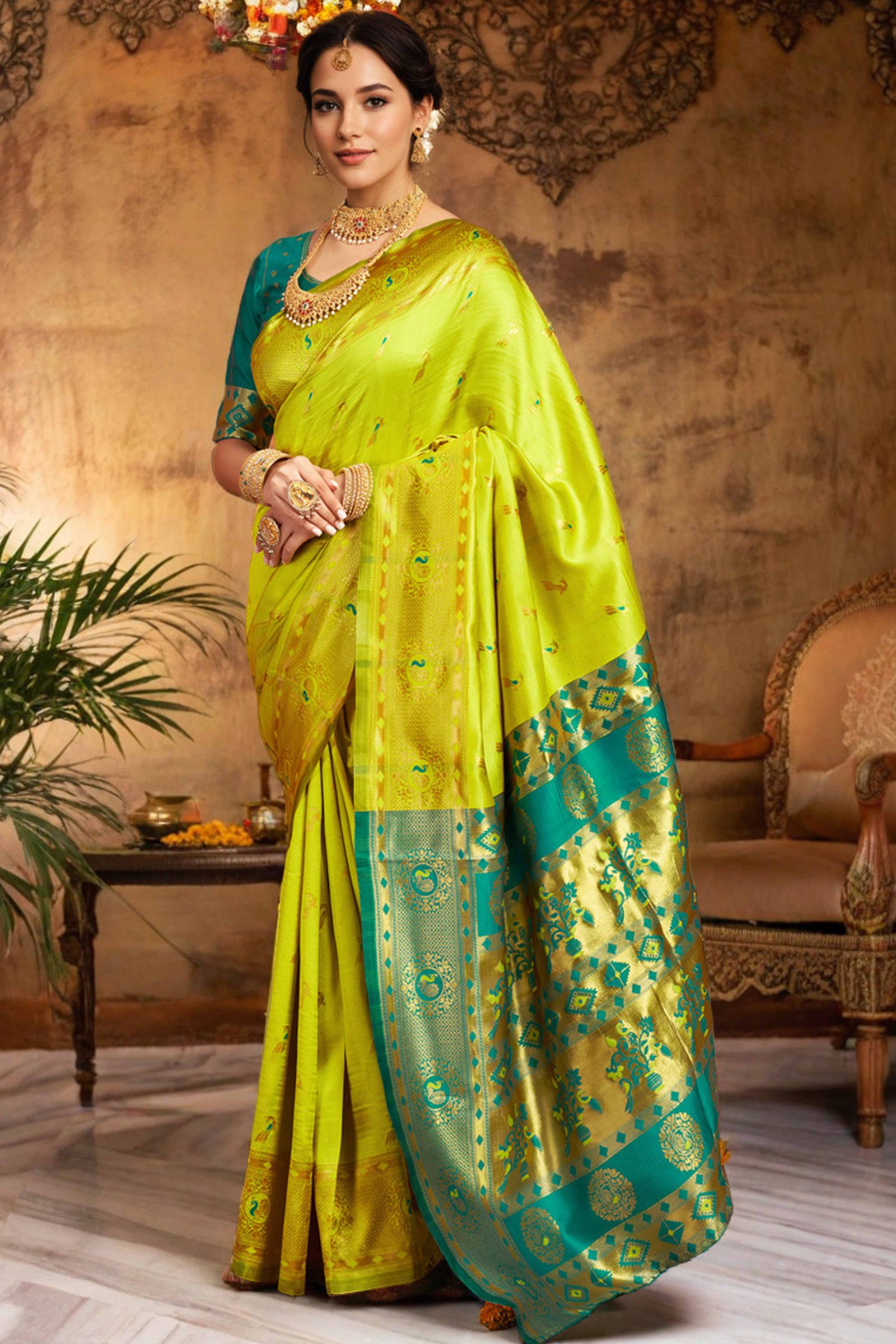 - Elegant Appeal: Step into timeless elegance with this exquisite lime green Paithani saree, adorned with intricate zari weaving and a meticulously crafted peacock and floral motif pallu. A graceful blend of tradition and sophistication, it’s designed to make a lasting impression at every special occasion.