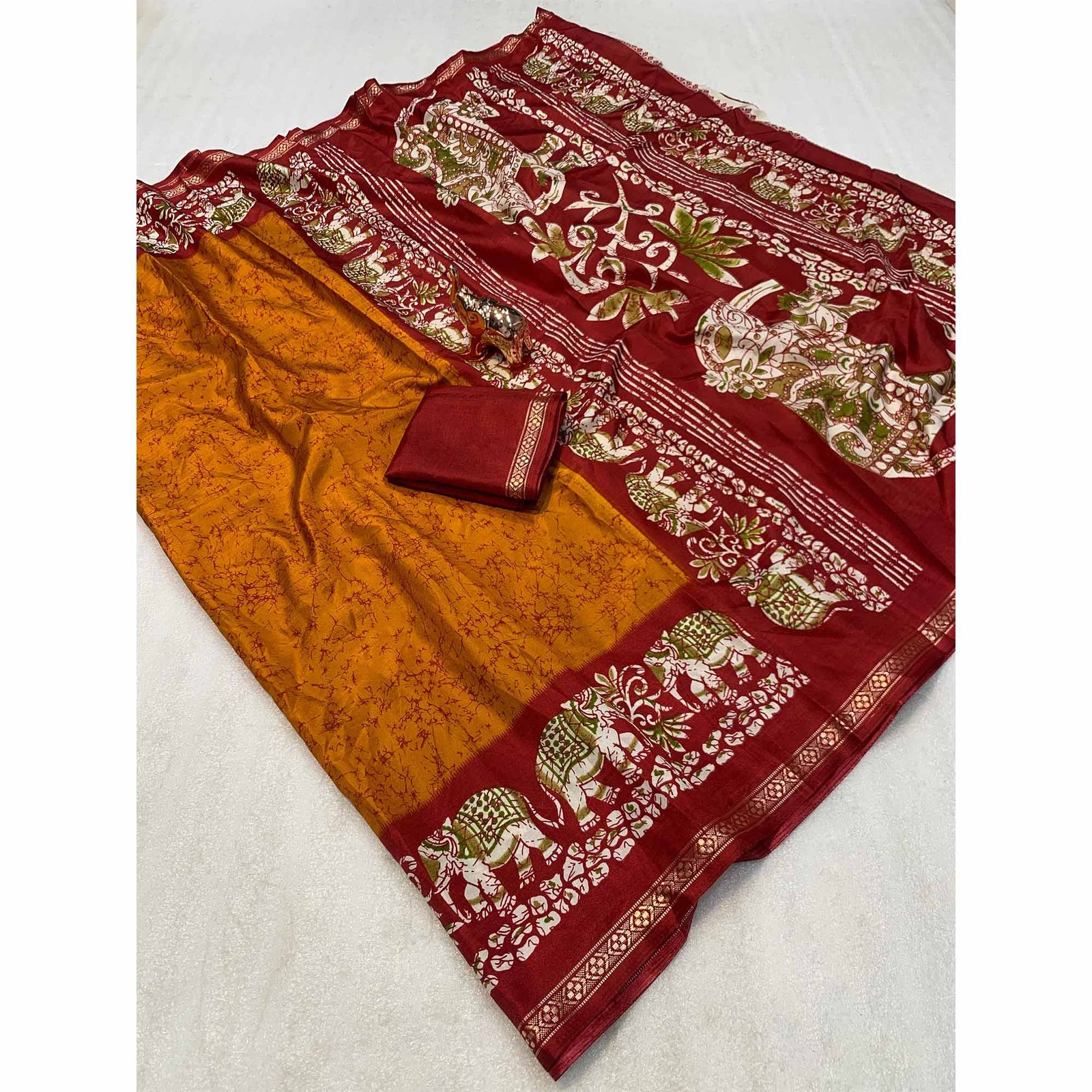 - Distinctive Design: Mustard saree is crafted from luxurious dola silk fabric, enhanced with abstract print and a beautifully detailed kalamkari print pallu.