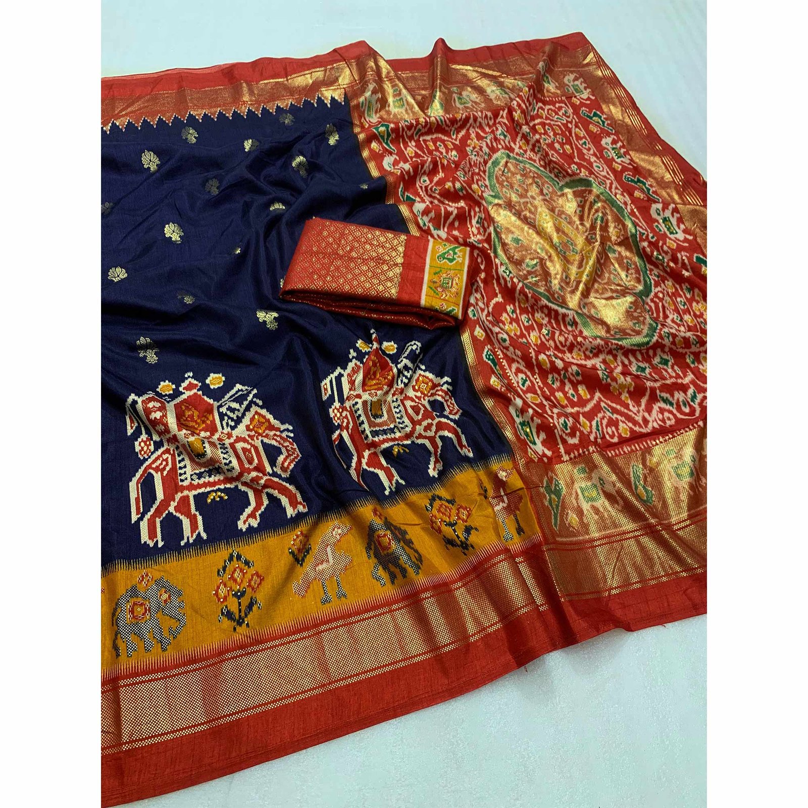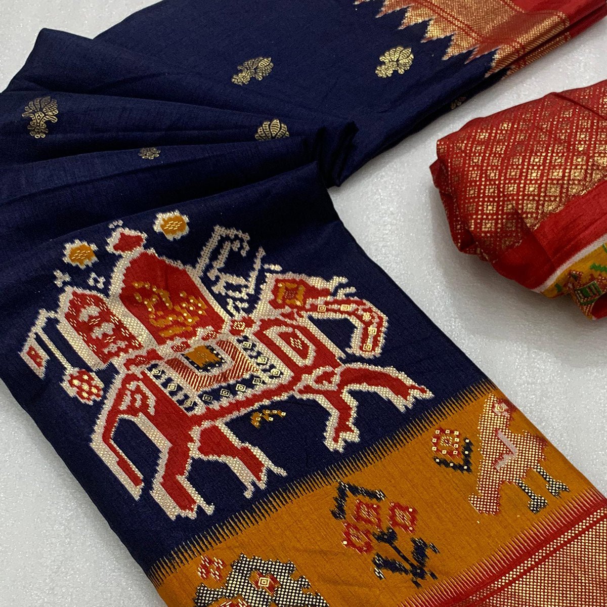 Navy Blue colored saree is made from dola silk fabric which is highlighted with beautiful patola print as shown. Comes along with unstitched dola silk blouse piece which you can customize as per your design/style. Occasion – You can wear this saree for festive and functions. Note:- the actual product may differ slightly in color and design from the one illustrated in the images when compared with computer or mobile screen.