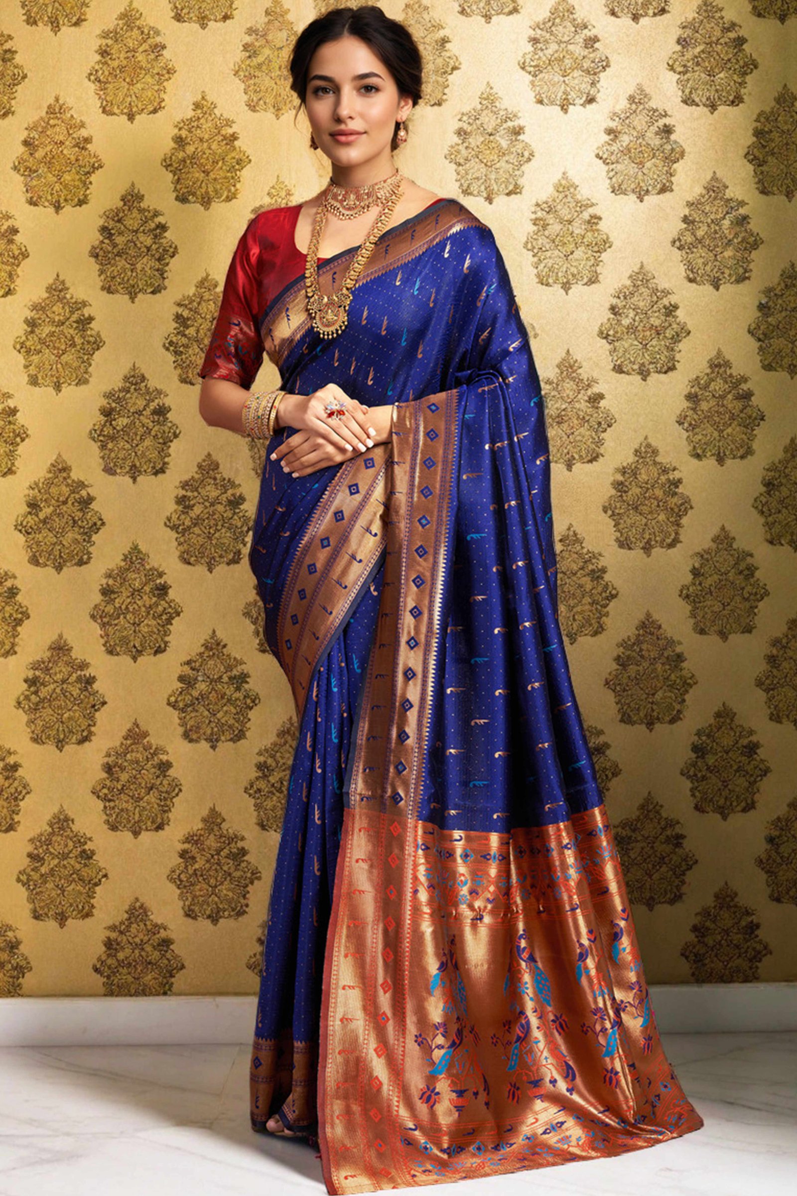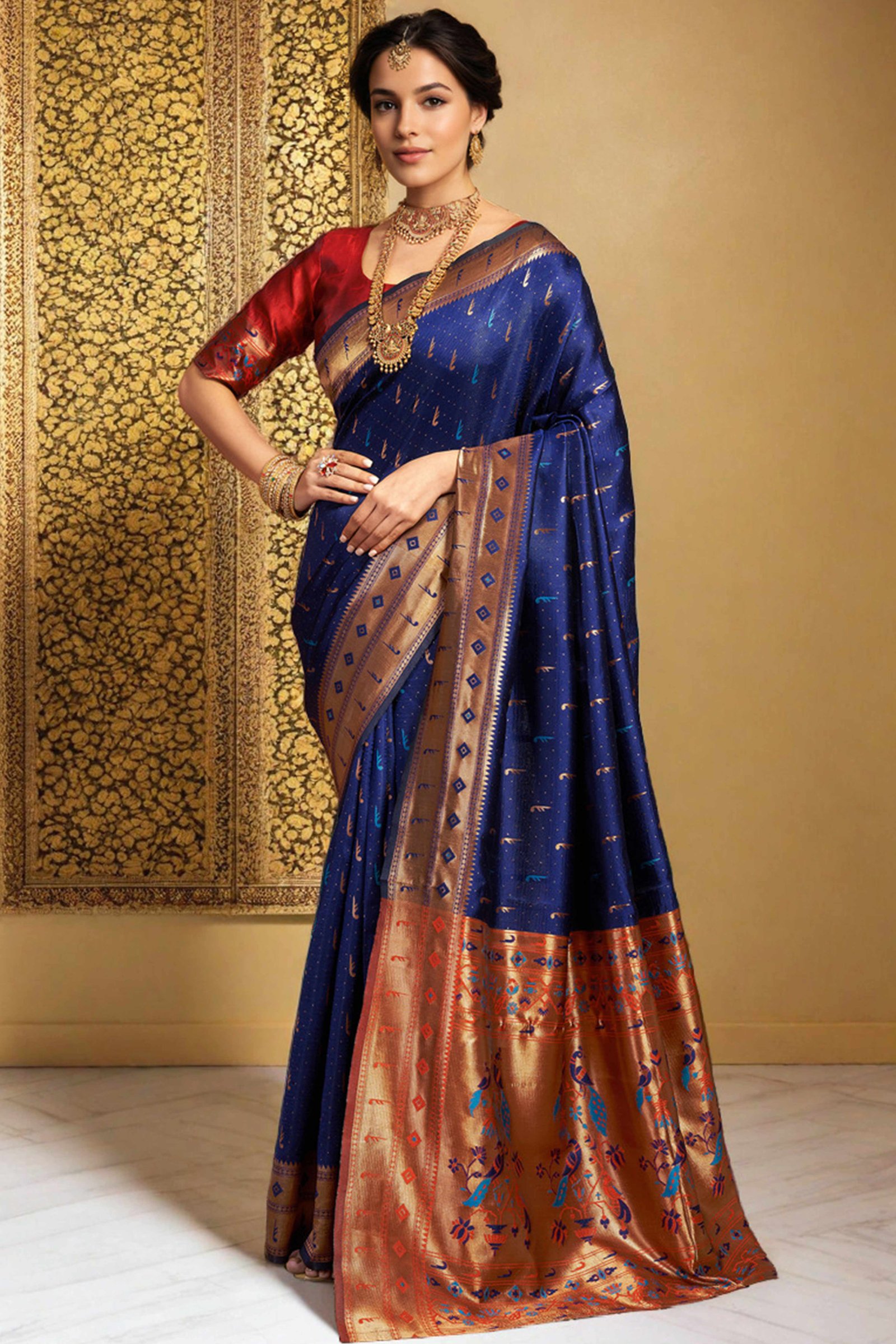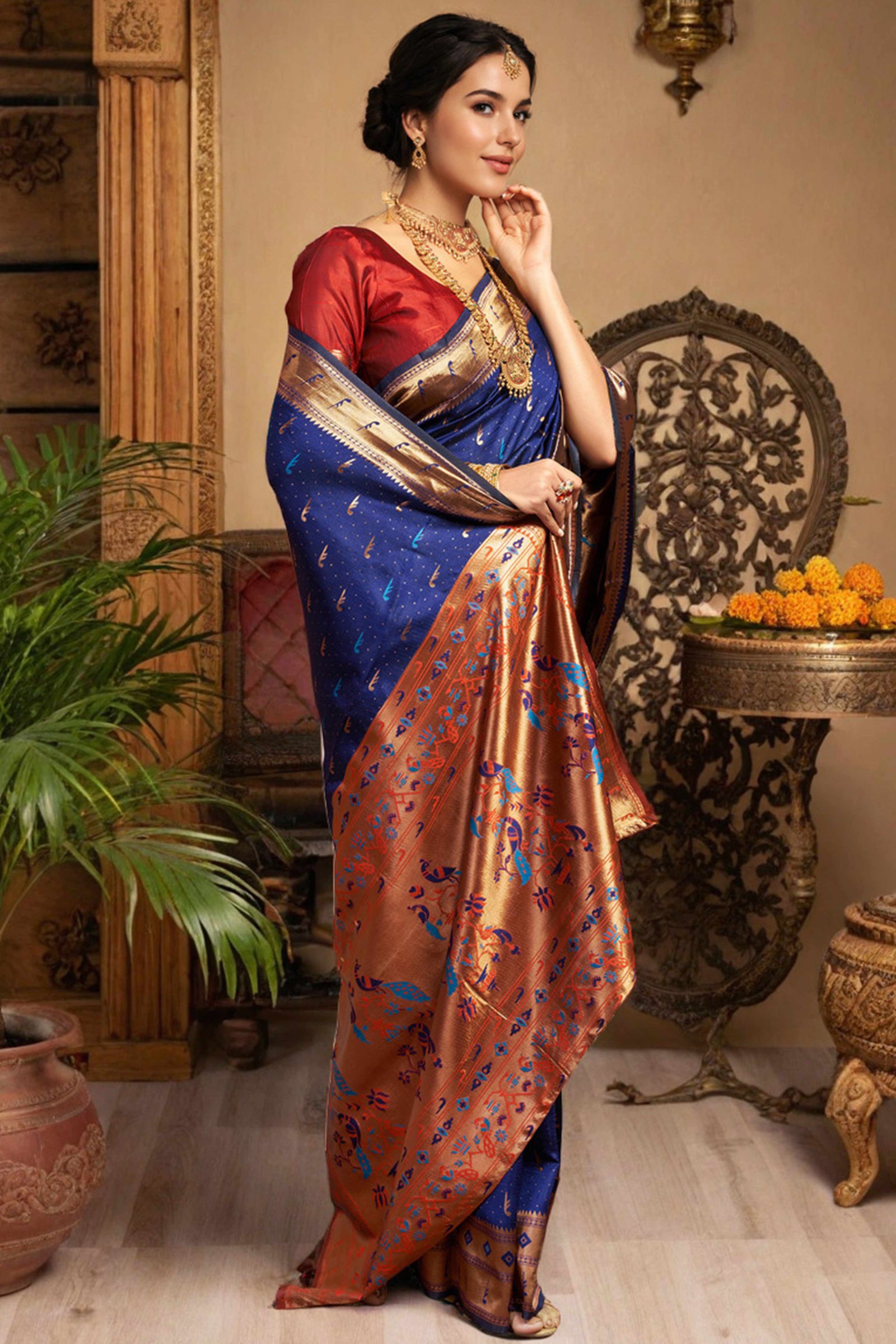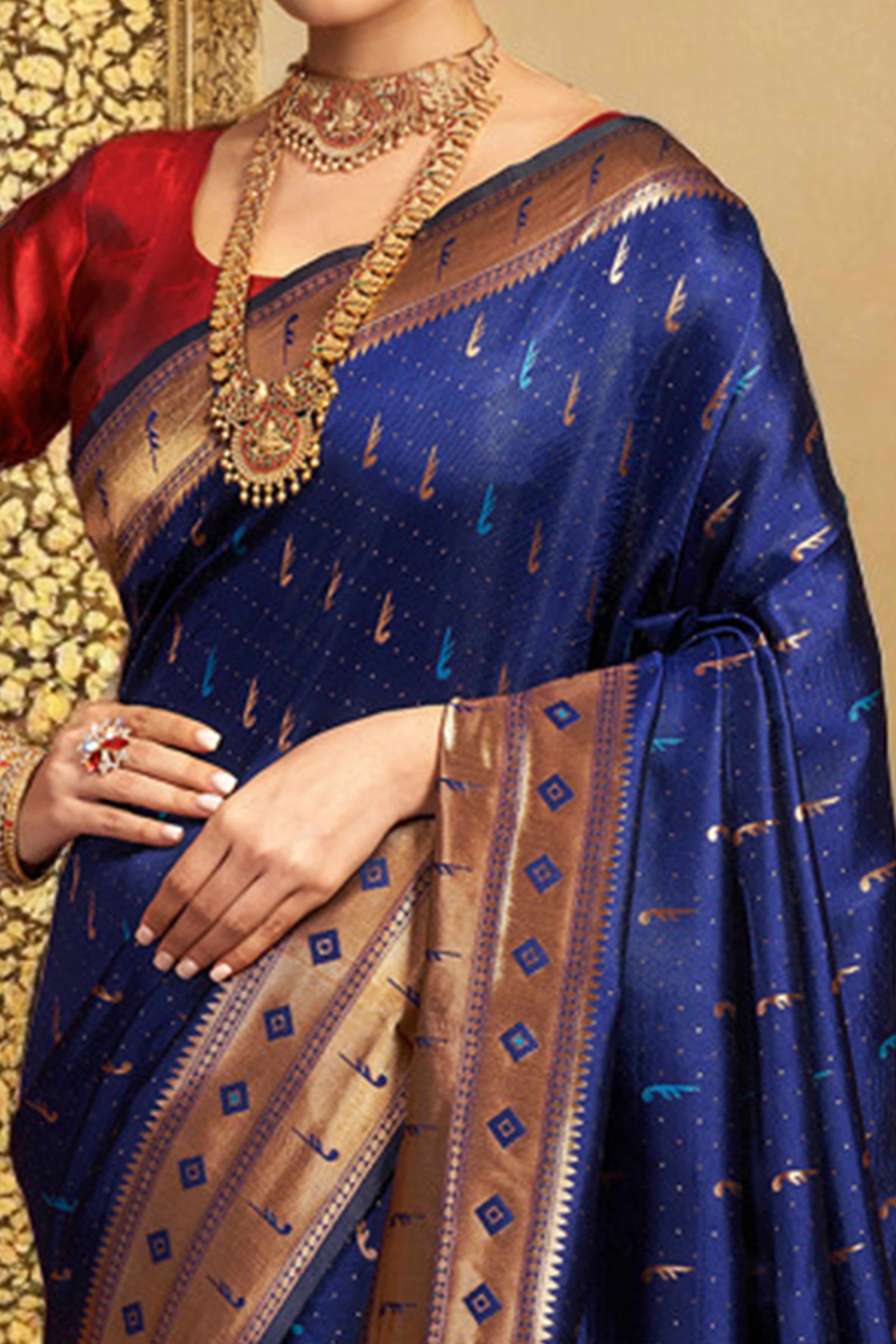 • Elegant Appeal: Infuse timeless elegance into your ethnic wardrobe with this stunning navy blue Paithani saree, adorned with intricate zari weaving and a gracefully detailed peacock motif pallu. A perfect blend of heritage and sophistication, it creates a striking impression at any special occasion.
