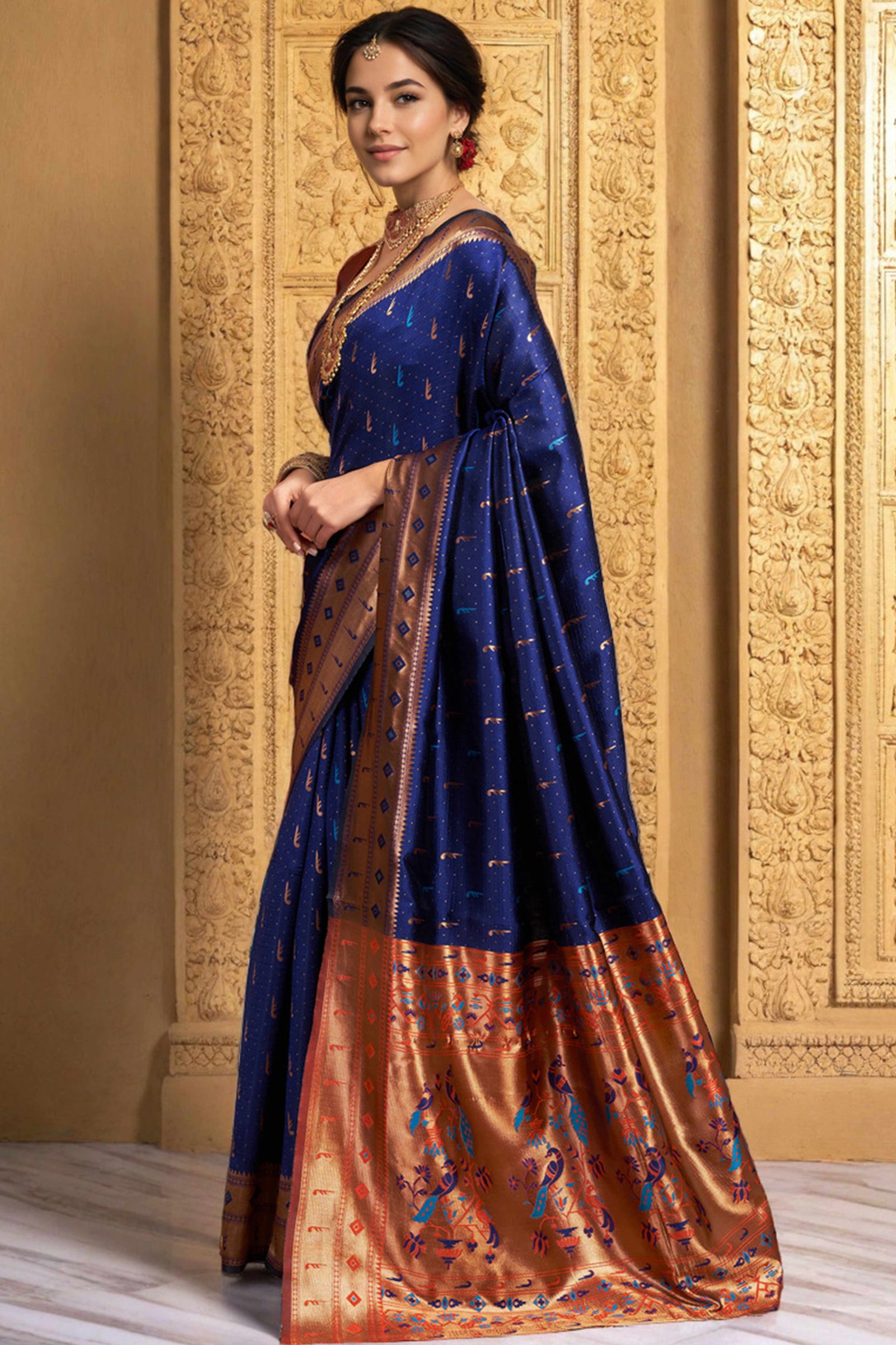 Navy Blue Silk Blend Paithani Saree Adorned With Zari Weaving & Peacock Motif Pallu