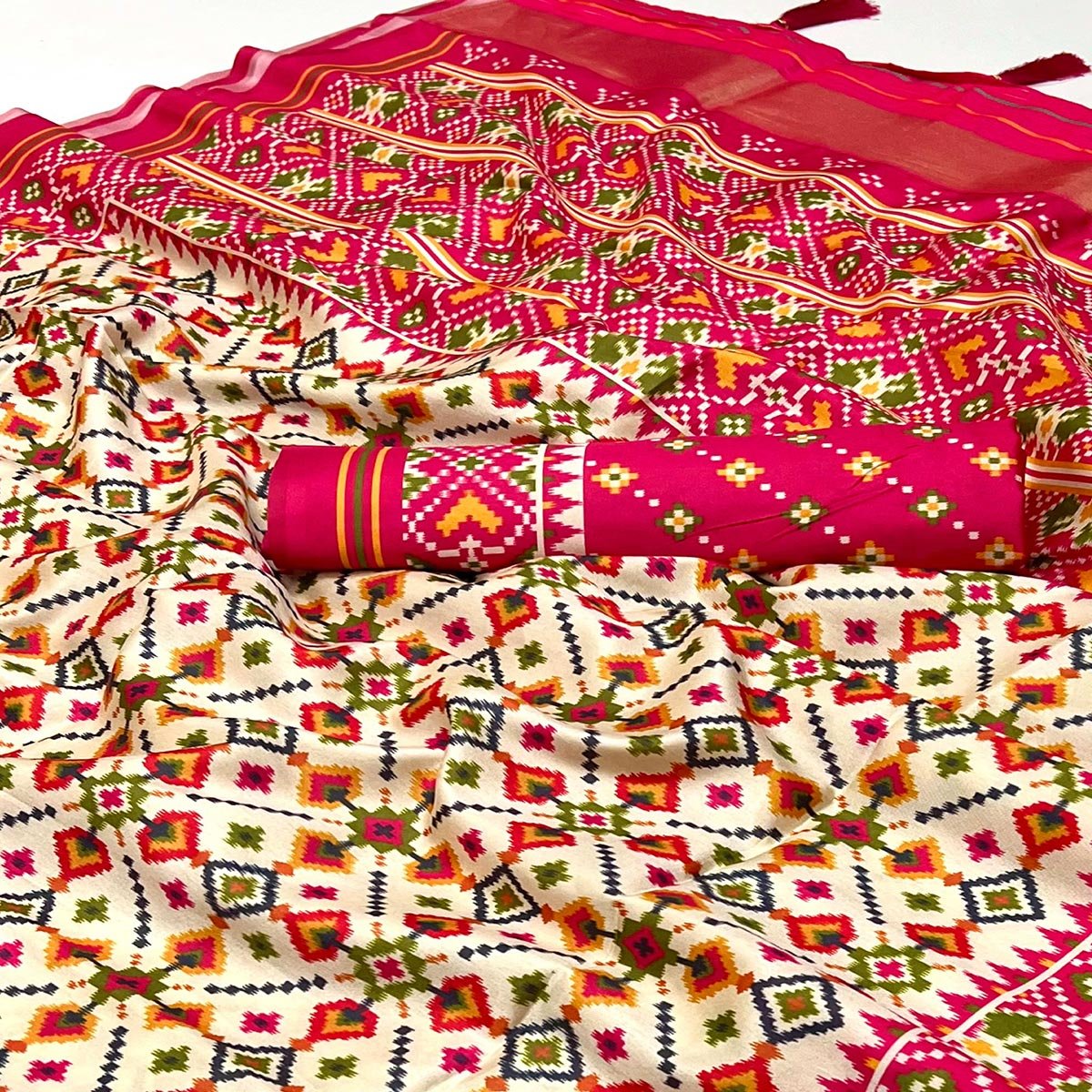 Off White colored saree is made from tussar silk fabric which is highlighted with beautiful patola printed work as shown. comes along with unstitched tussar silk blouse which you can customise as per your design/style. Occasion – You can wear this saree for festive and functions, outing and get-together.