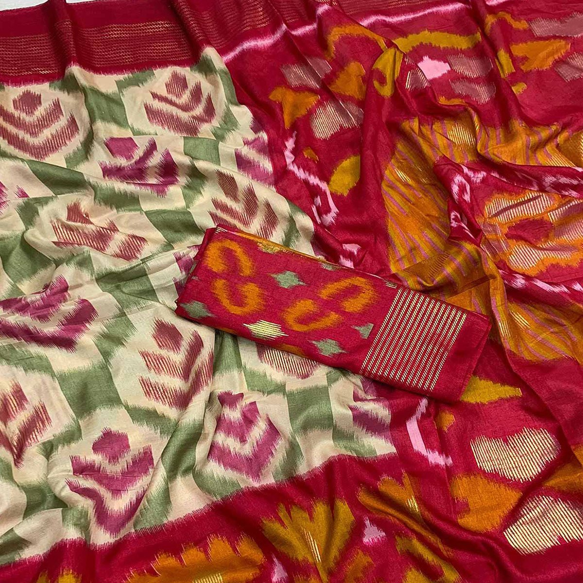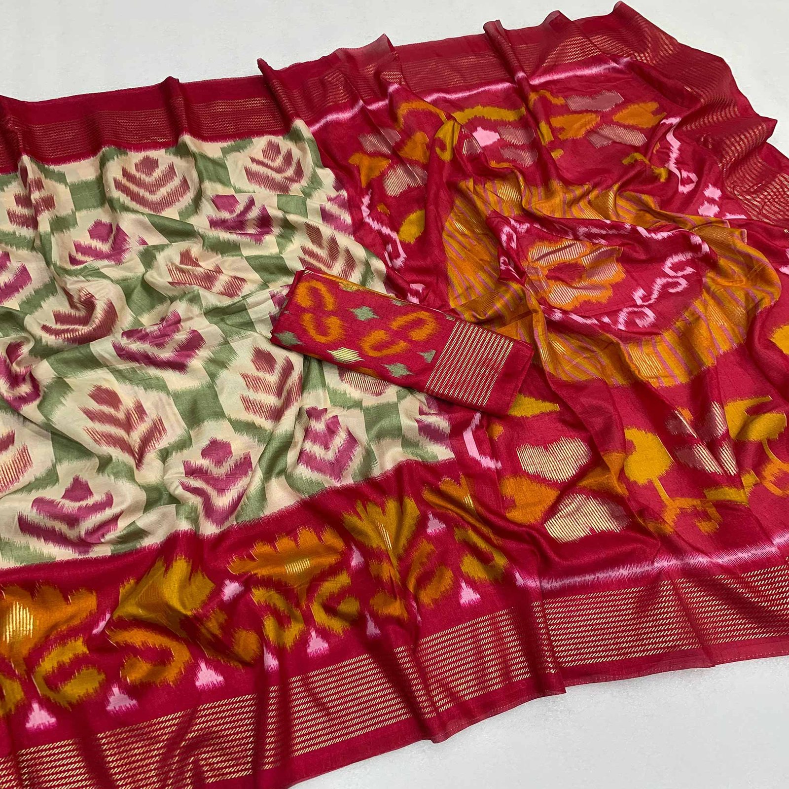 Off White & Pink colored saree is made from viscose fabric which is highlighted with beautiful patola printed work as shown. comes along unstitched viscose blouse piece which you can customise as per your design/style. Occasion – You can wear this saree for festive and functions.