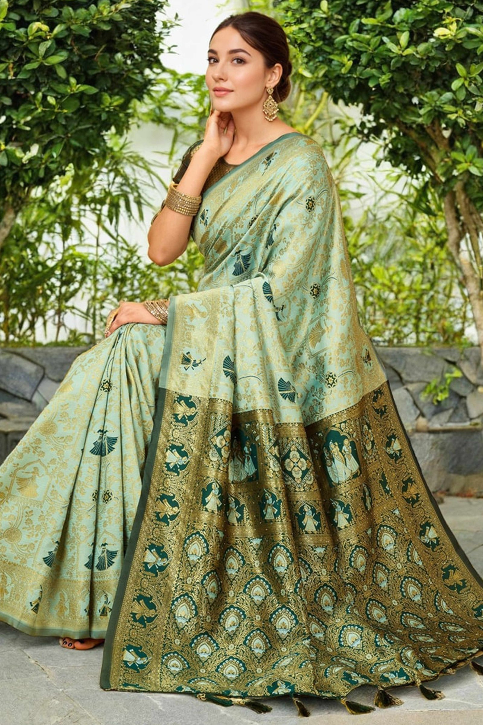 Pastel Mint Green Paithani Saree In Silk Blend Highlighted With Floral Weaving & Tasselled Edge