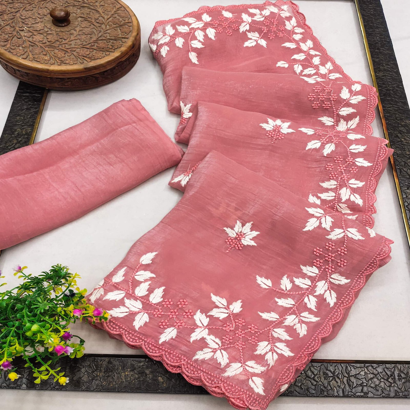 Be the first to review “Peach Organza Saree Featuring Fine Floral Embroidery”