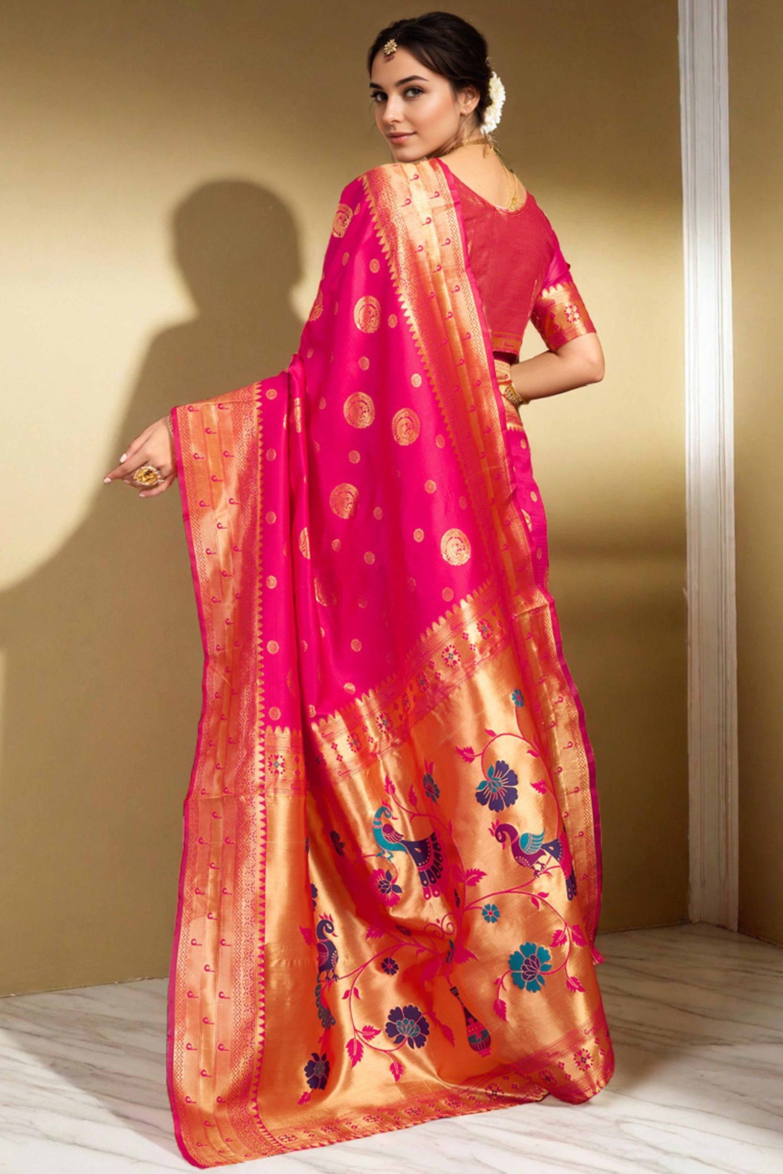 Pink Paithani Silk Blend Saree Embellished With Zari Peacock & Floral Woven Patterns