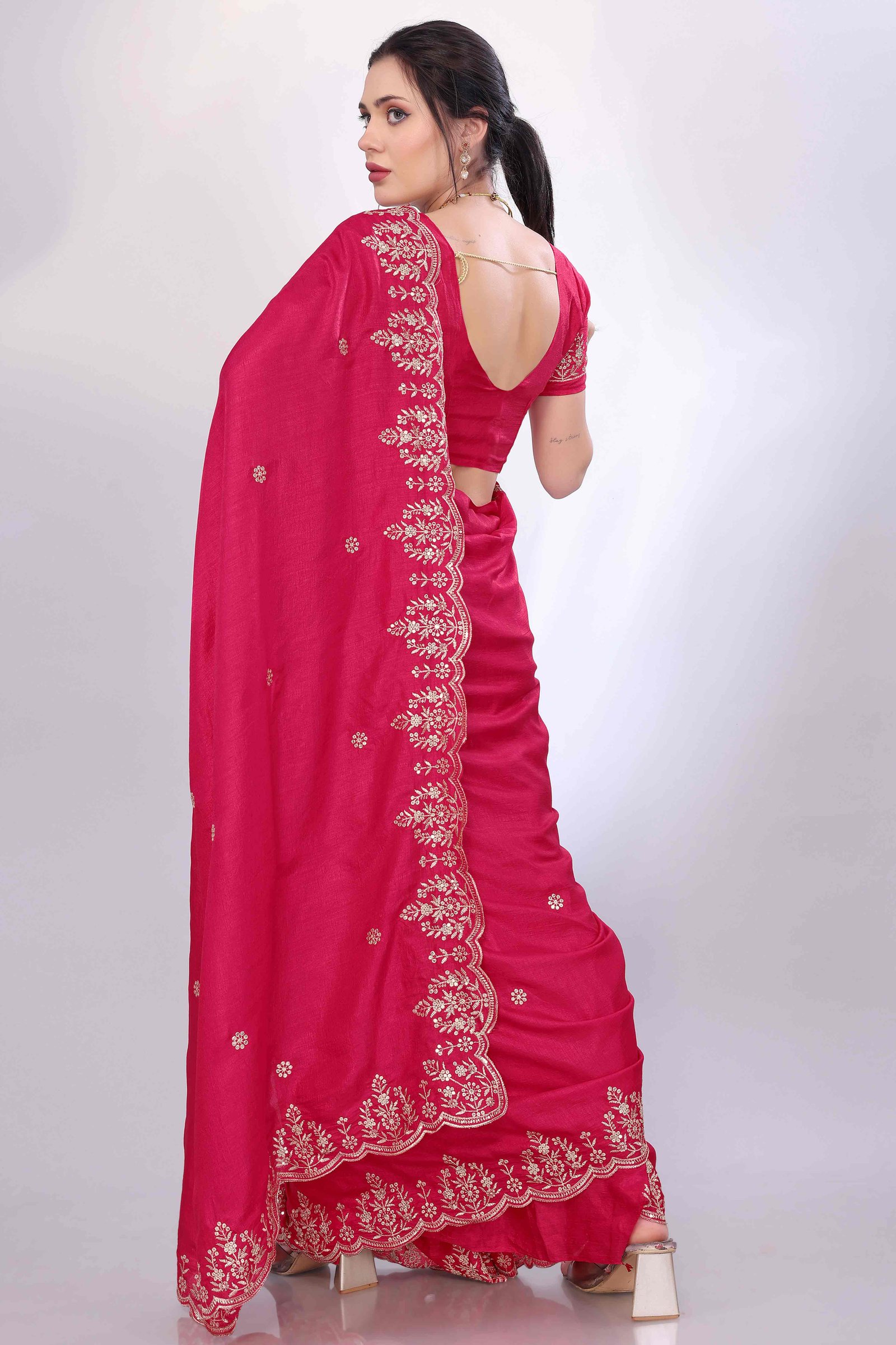 Pink Zari Embroidered Saree In Vichitra Silk With Shimmering Floral Sequins Work