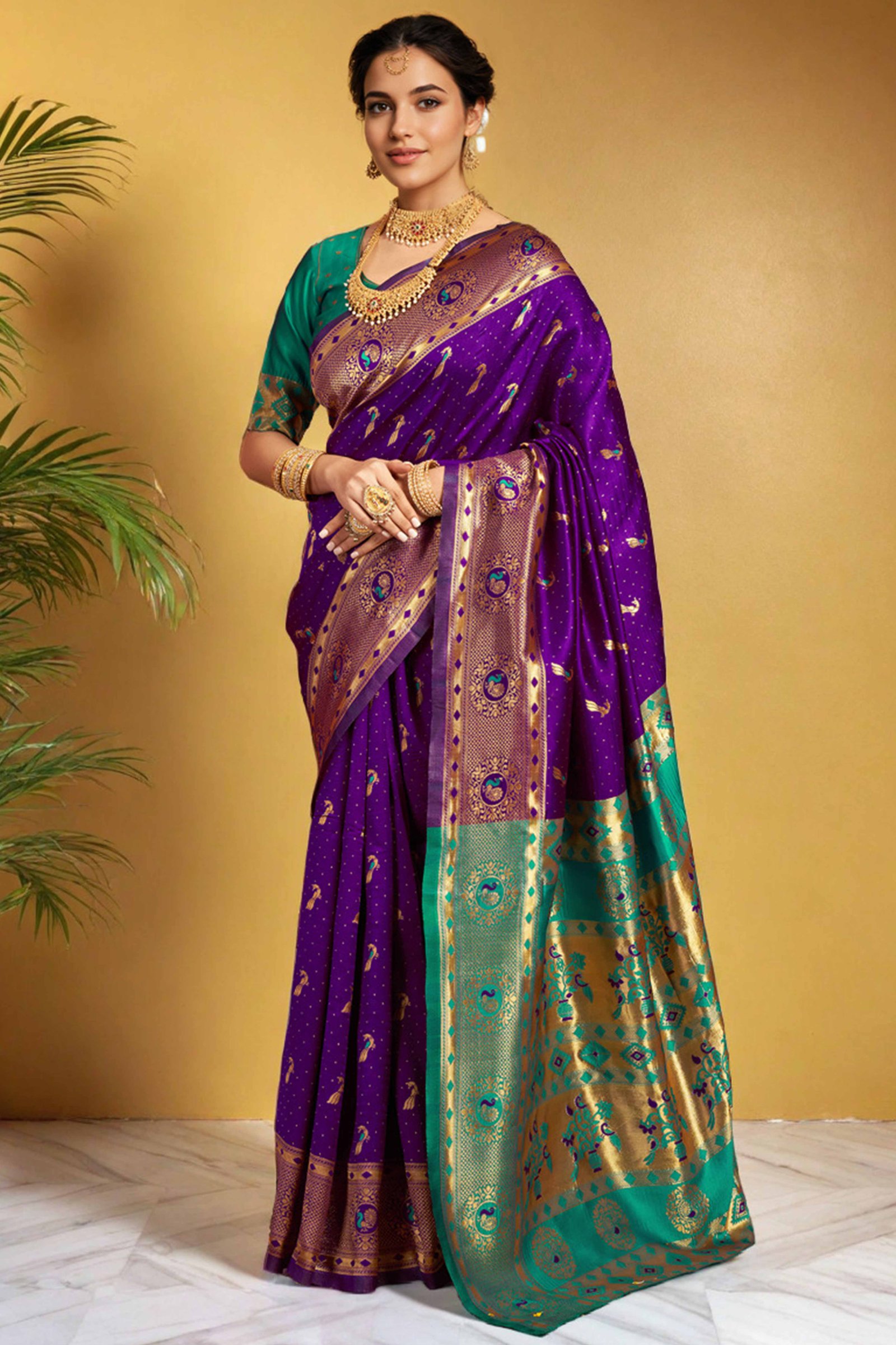 - Elegant Appeal: Step into timeless elegance with this exquisite purple Paithani saree, adorned with intricate zari weaving and a meticulously crafted peacock and floral motif pallu. A graceful blend of tradition and sophistication, it’s designed to make a lasting impression at every special occasion.