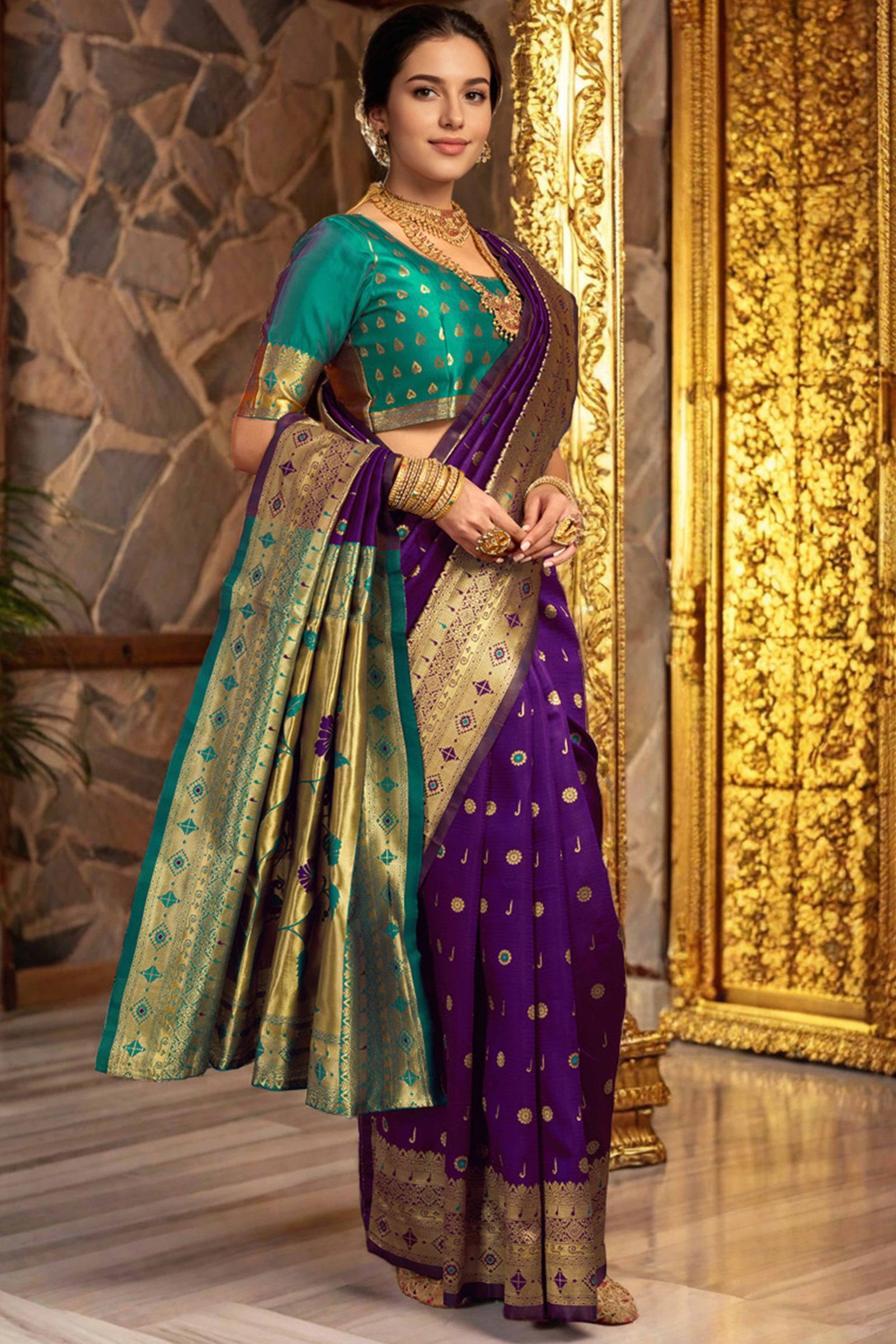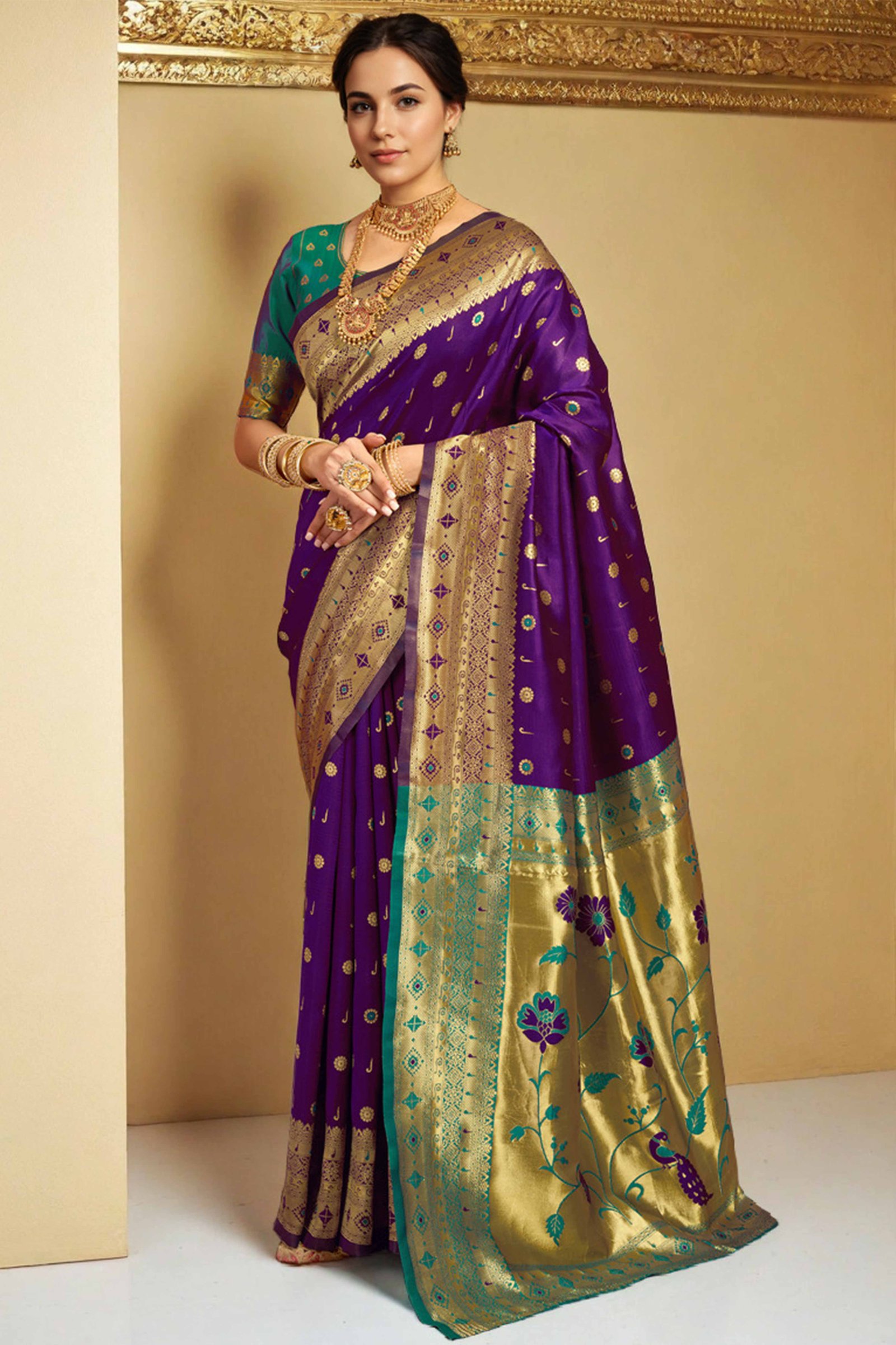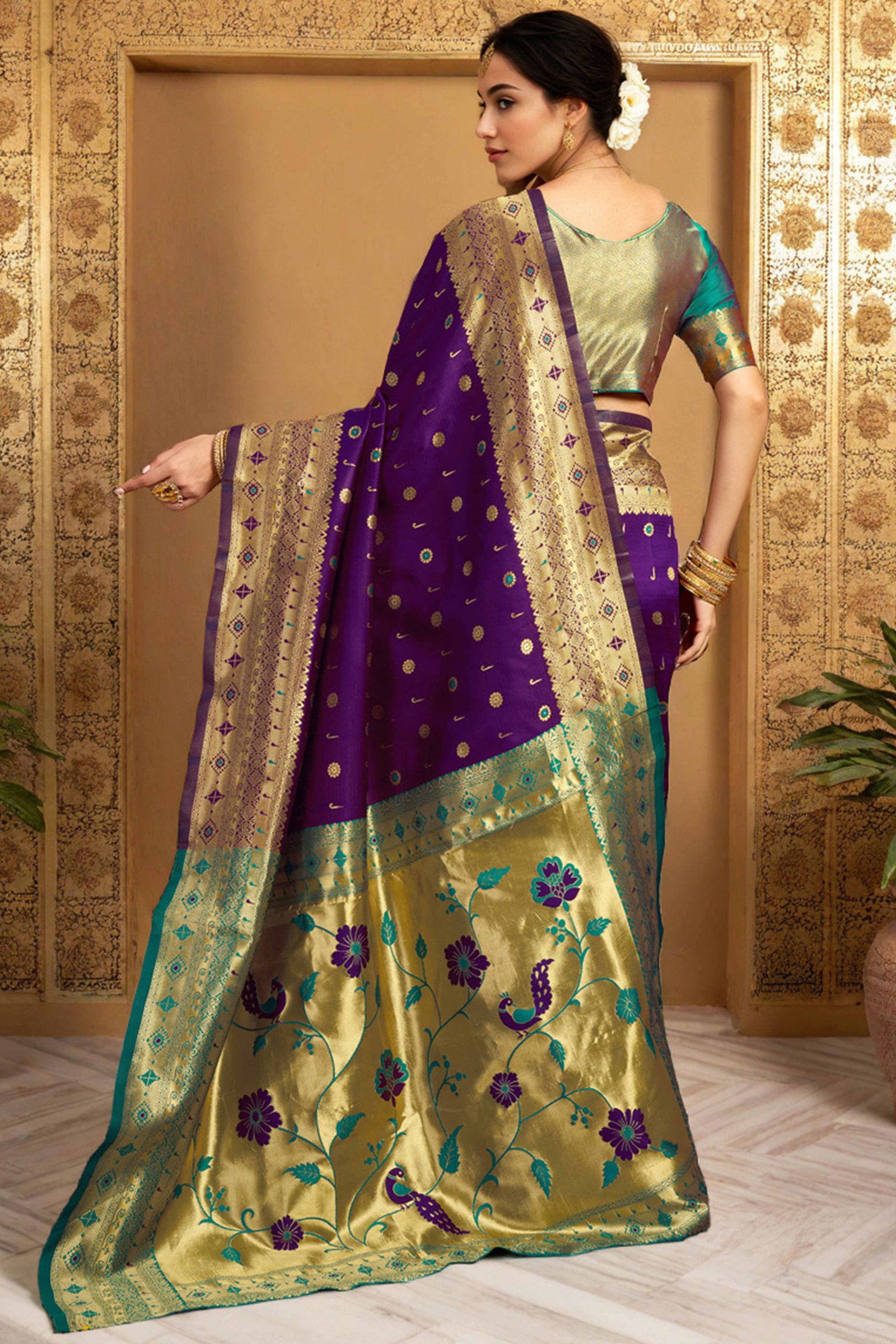 - Elegant Appeal: Celebrate tradition with a modern touch in this elegant purple Paithani saree, adorned with intricate zari weaving and a meticulously crafted peacock and floral motif pallu. A graceful blend of tradition and sophistication, it’s designed to make a lasting impression at every special occasion.