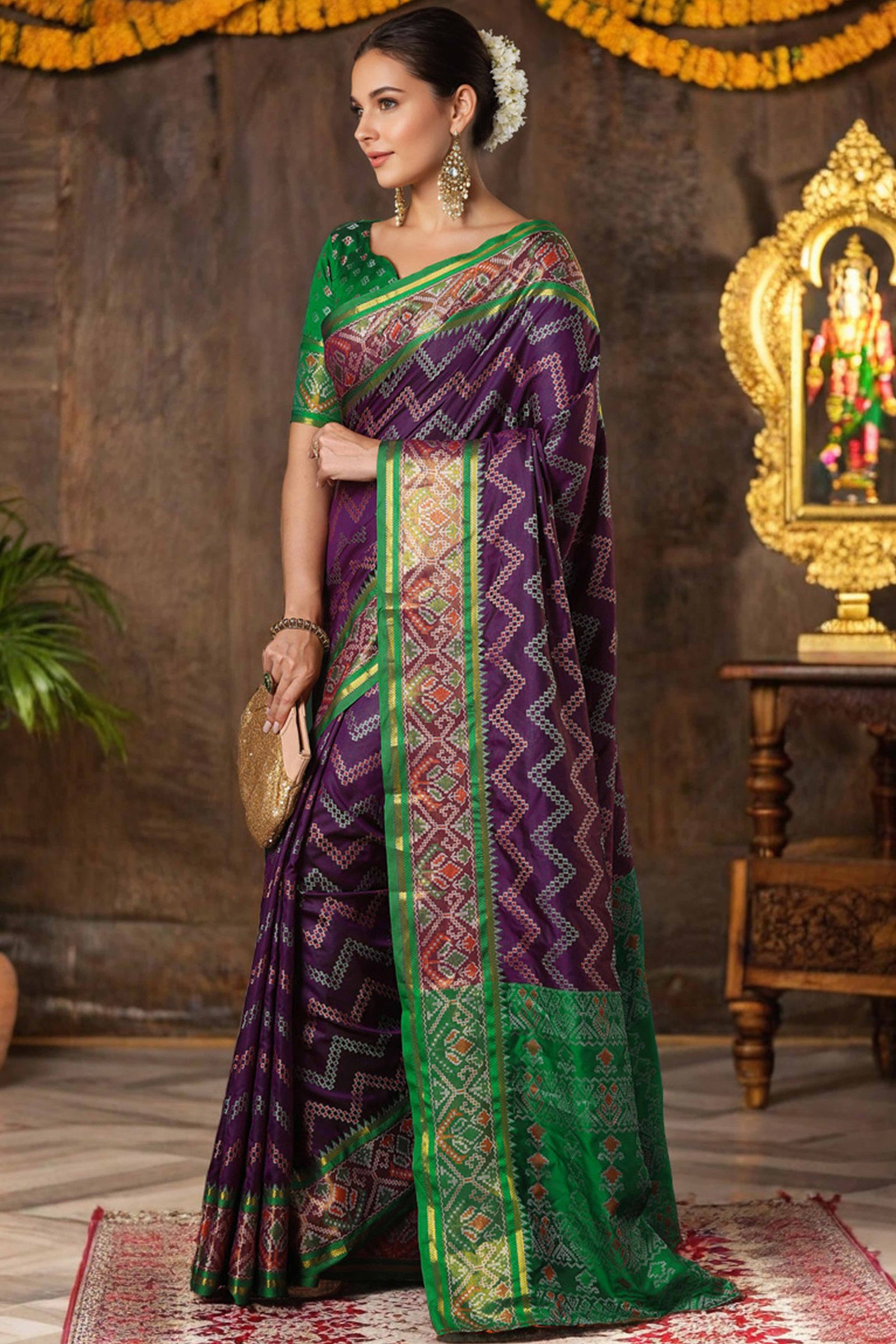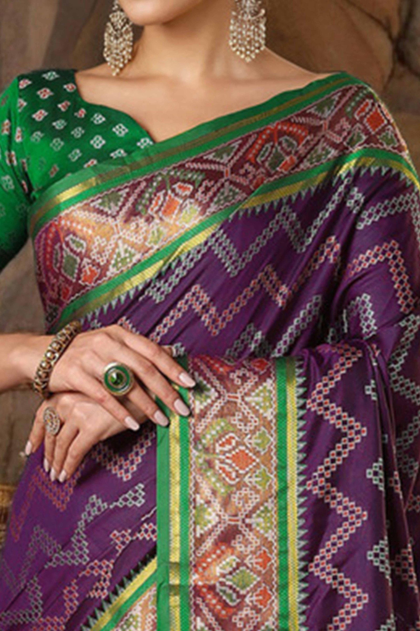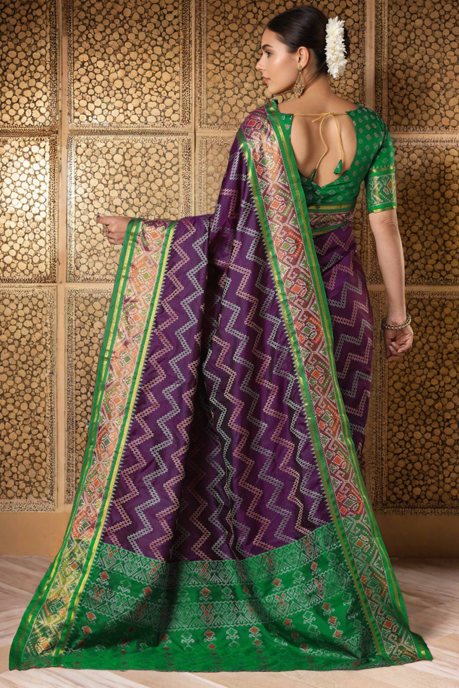 - Striking Heritage: Embrace the vibrance of tradition with this eye-catching purple Patola saree, featuring classic zig zag zari weaving and a stylish tassel-accented pallu. A timeless expression of cultural beauty, it’s designed to make you stand out at every celebration.