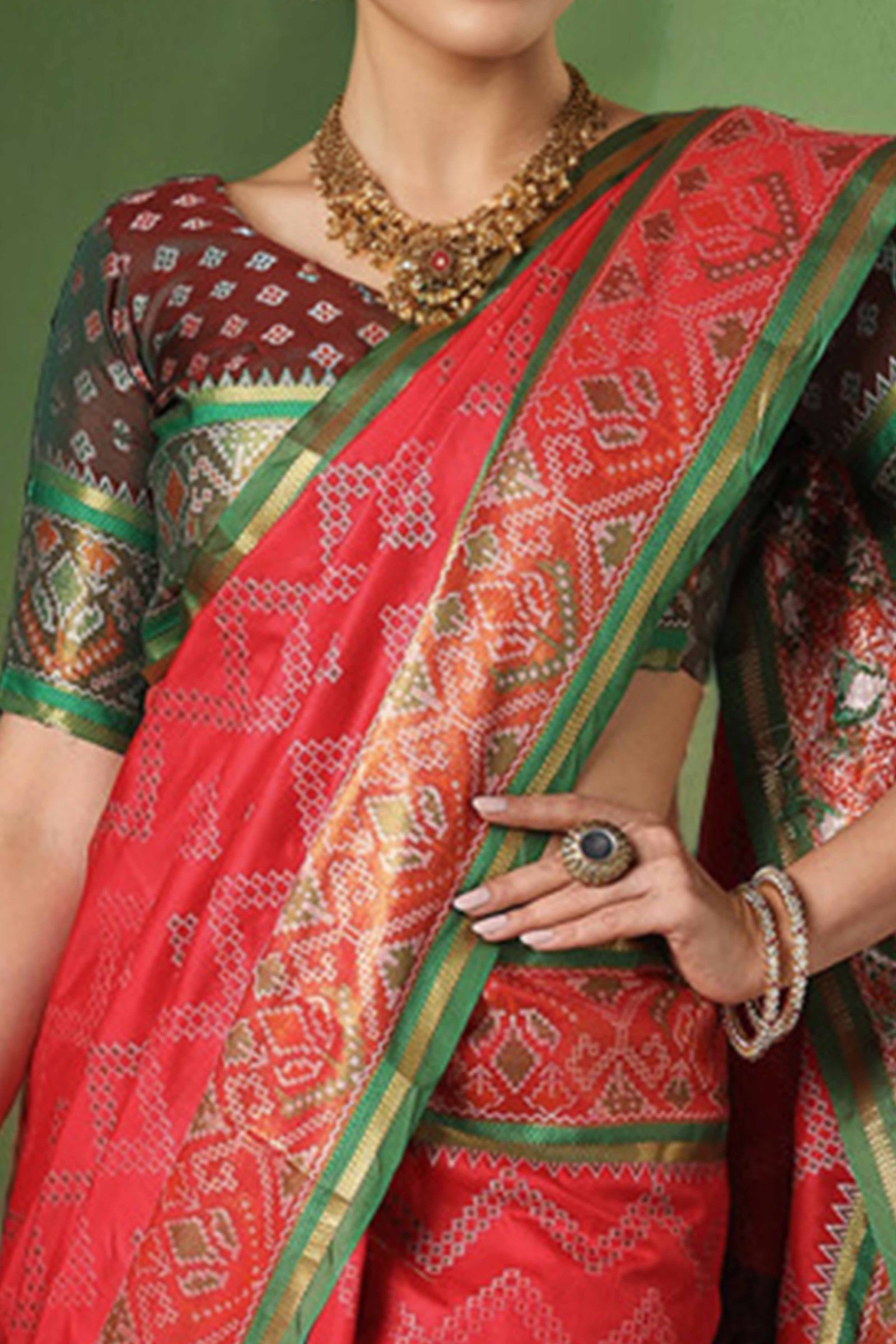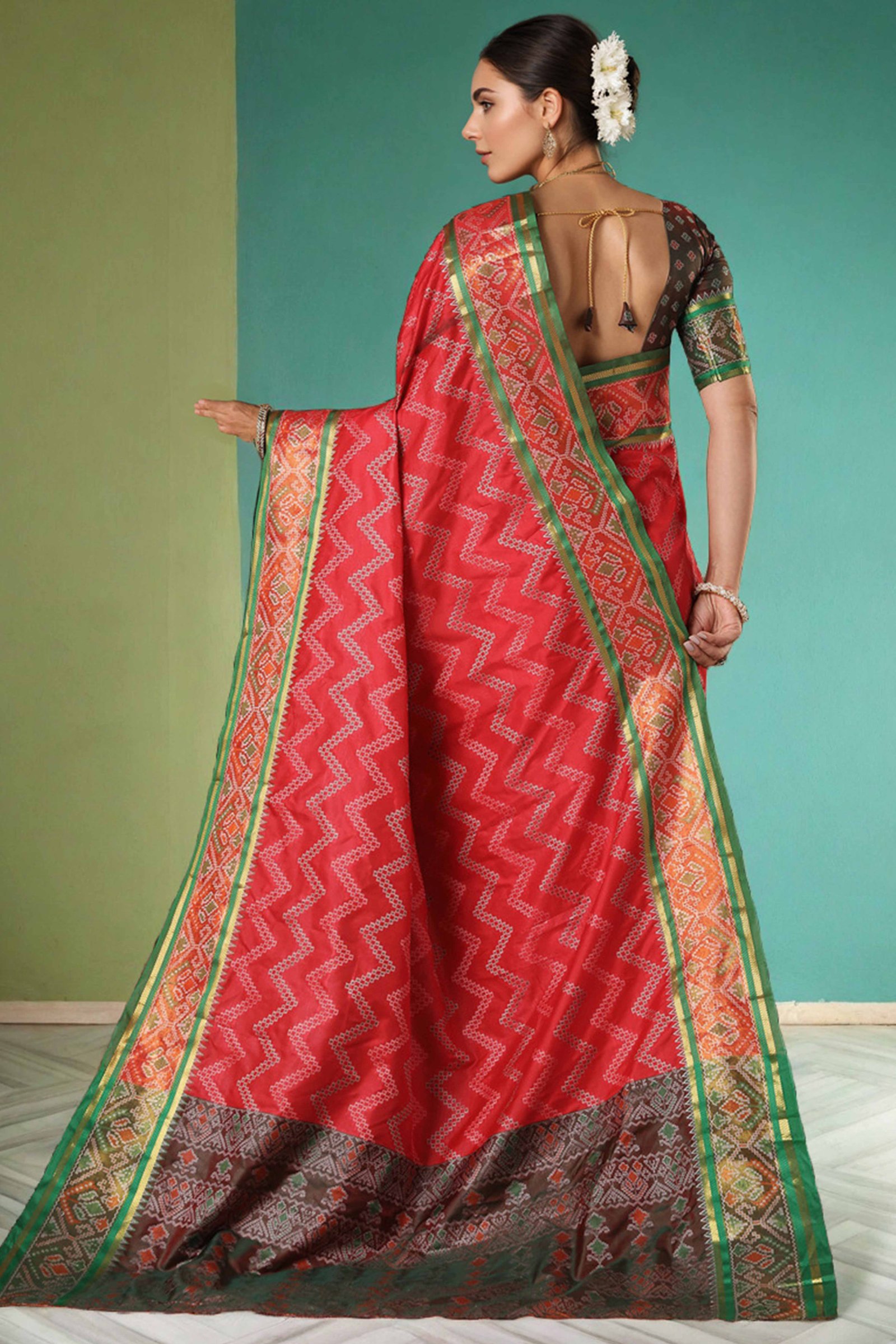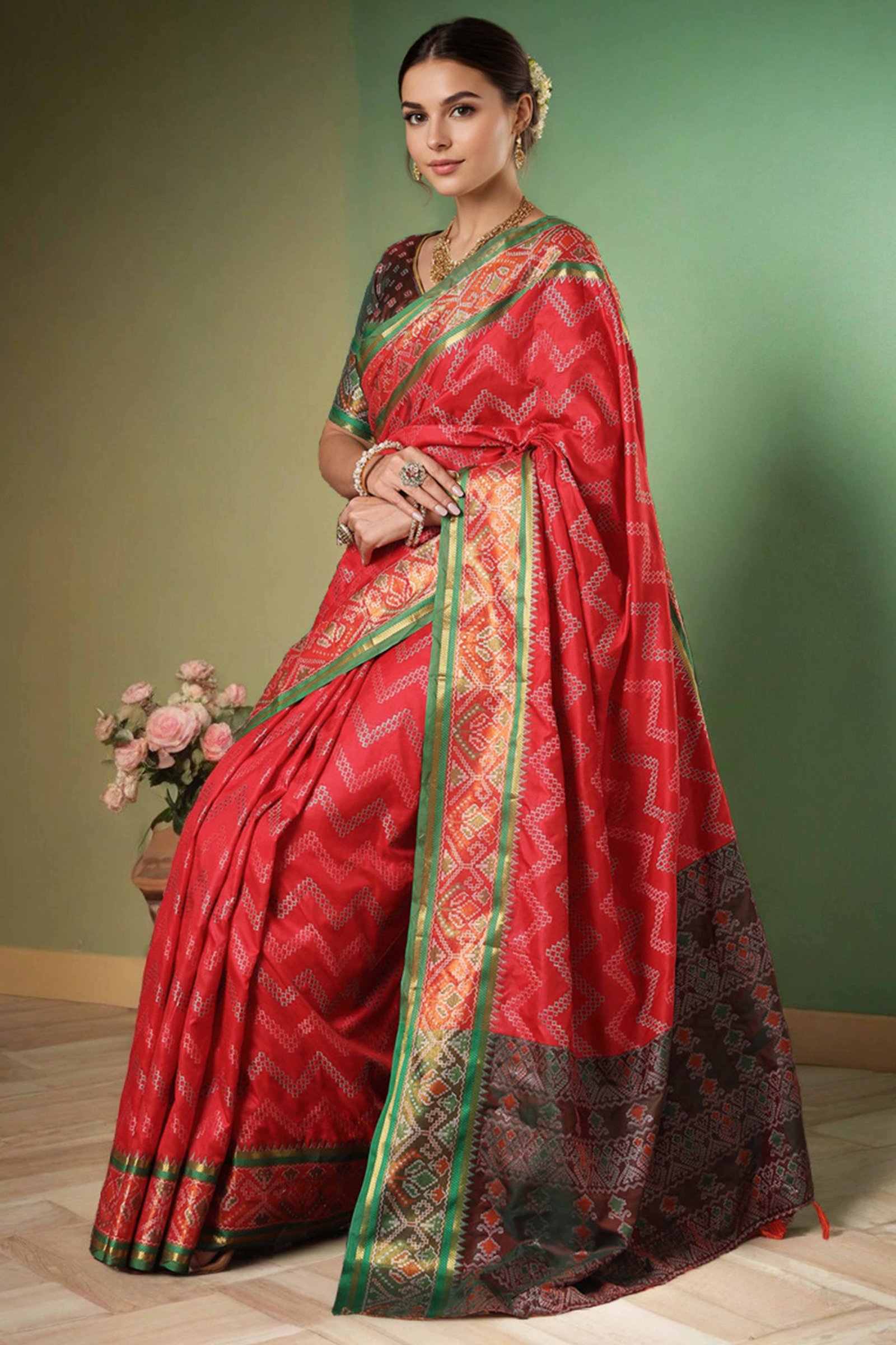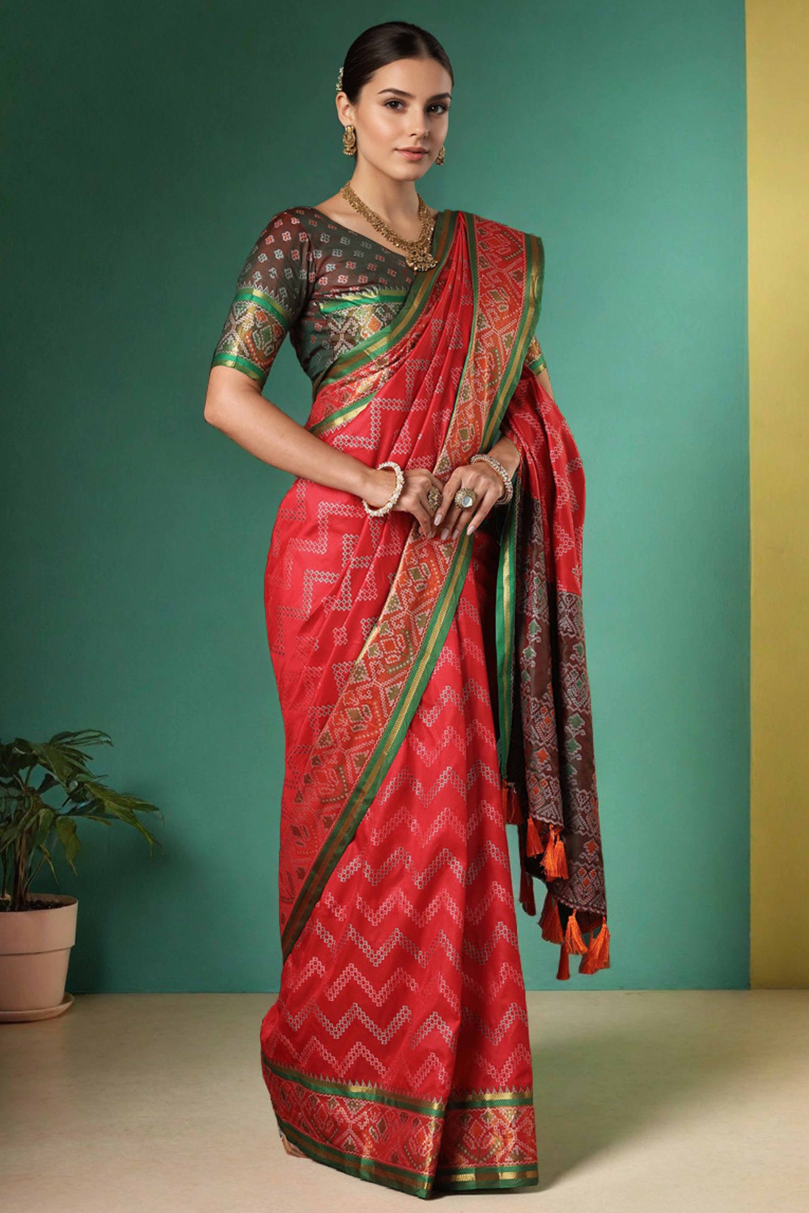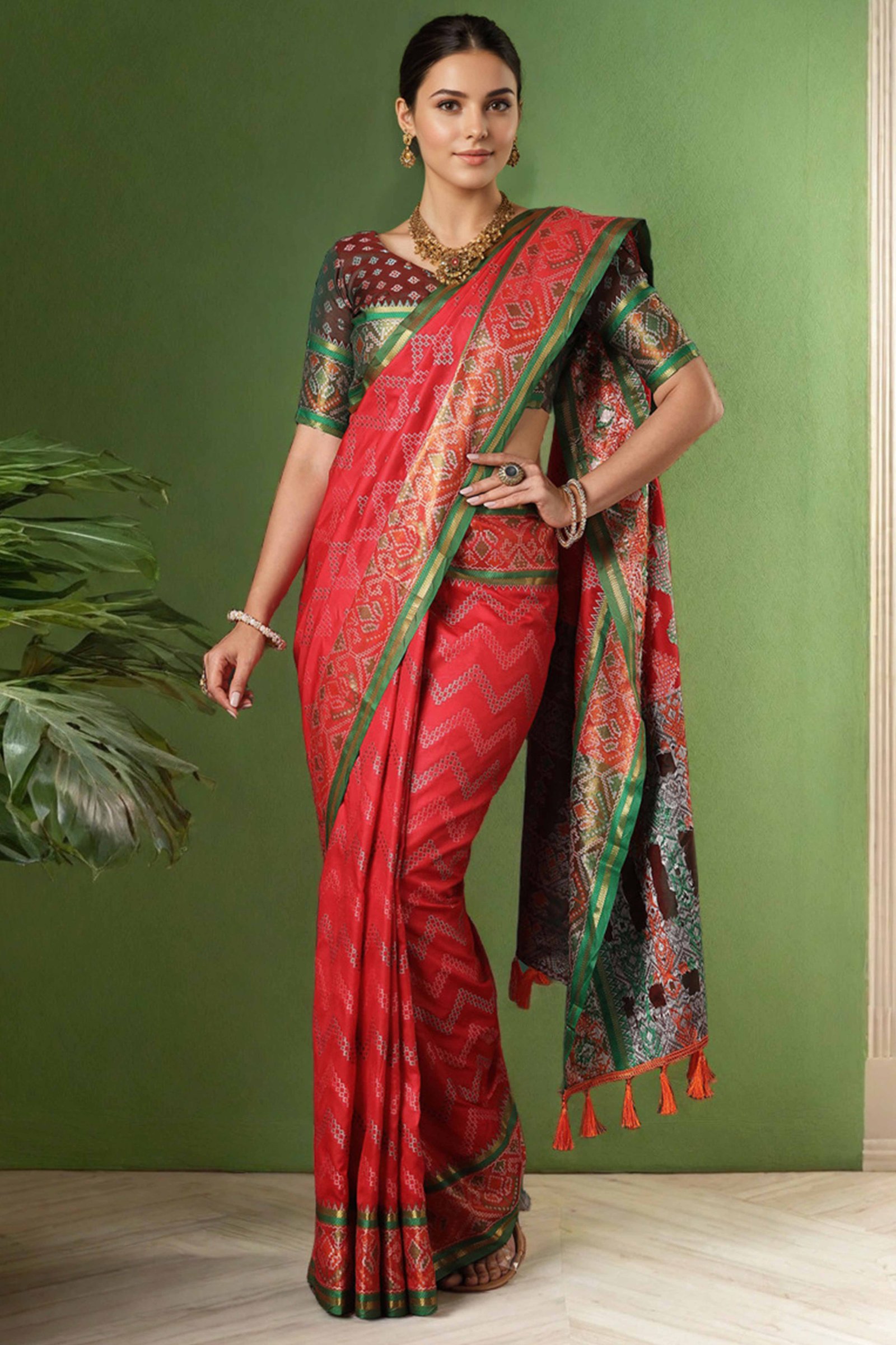 Red Silk Blend Saree With Traditional Zig Zag Patola Weaving & Tassel Pallu