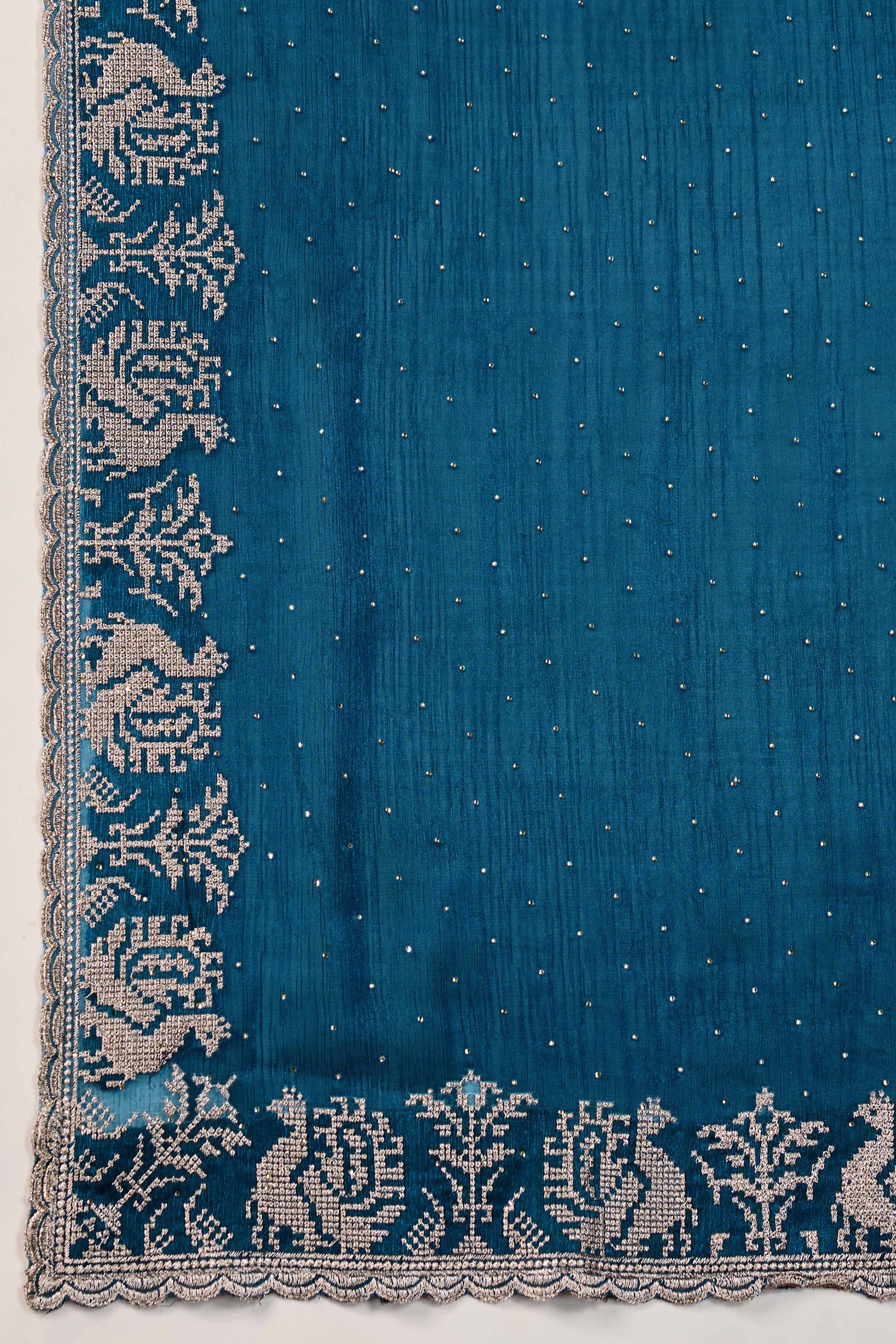 - Graceful Appeal: Teal saree is crafted from a rich silk blend fabric and enhanced with exquisite embroidery and delicate stone work for a refined look.