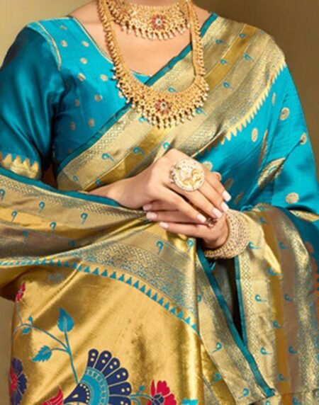 - Chic & Feminine: Drape yourself in elegance with this teal saree, exquisitely embellished with intricate floral thread and aari embroidery, further enhanced with shimmering stone and mirror work for a captivating finish.