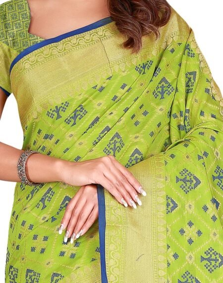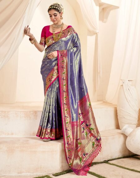 Yellow colored paithani saree is made from tissue fabric which is highlighted with beautiful weaving work as shown. comes along unstitched banarasi silk blouse piece which you can customise as per your design/style. Occasion – You can wear this saree for festive, wedding and functions.